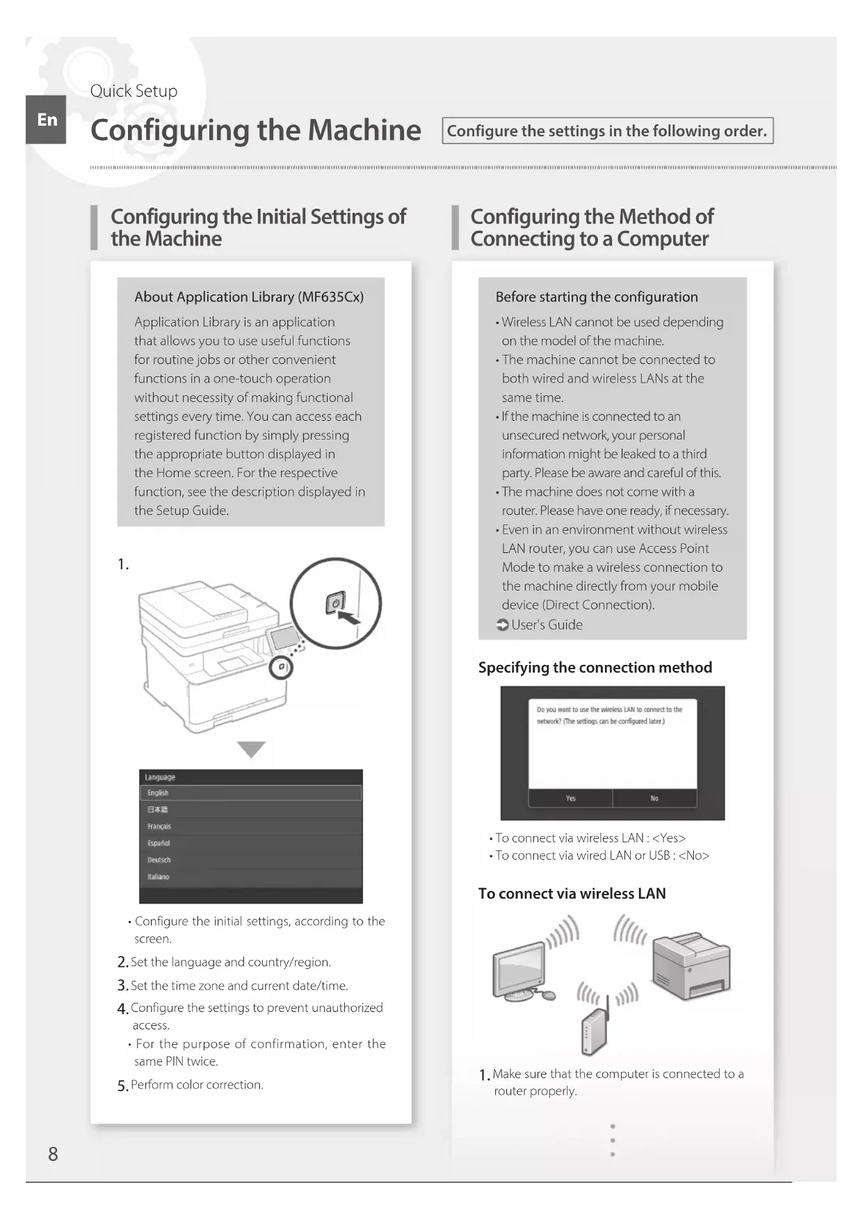 - Configure the initial settings, according to the screen. Set the language and country/region. Set the time zone and current date/time. Configure the settings to prevent unauthorized access.• For the purpose of confirmation, enter the same PIN twice. Perform color correction.Before starting the configuration• Wireless LAN cannot be used depending on the model of the machine.• The machine cannot be connected to both wired and wireless LANs at the same time.• If the machine is connected to an unsecured network, your personal information might be leaked to a third party. Please be aware and careful of this.• The machine does not come with a router. Please have one ready, if necessary.• Even in an environment without wireless LAN router, you can use Access Point Mode to make a wireless connection to the machine directly from your mobile device (Direct Connection). User's GuideSpecifying the connection method• To connect via wireless LAN : <Yes>• To connect via wired LAN or USB : <No>To connect via wireless LAN Make sure that the computer is connected to a router properly.
