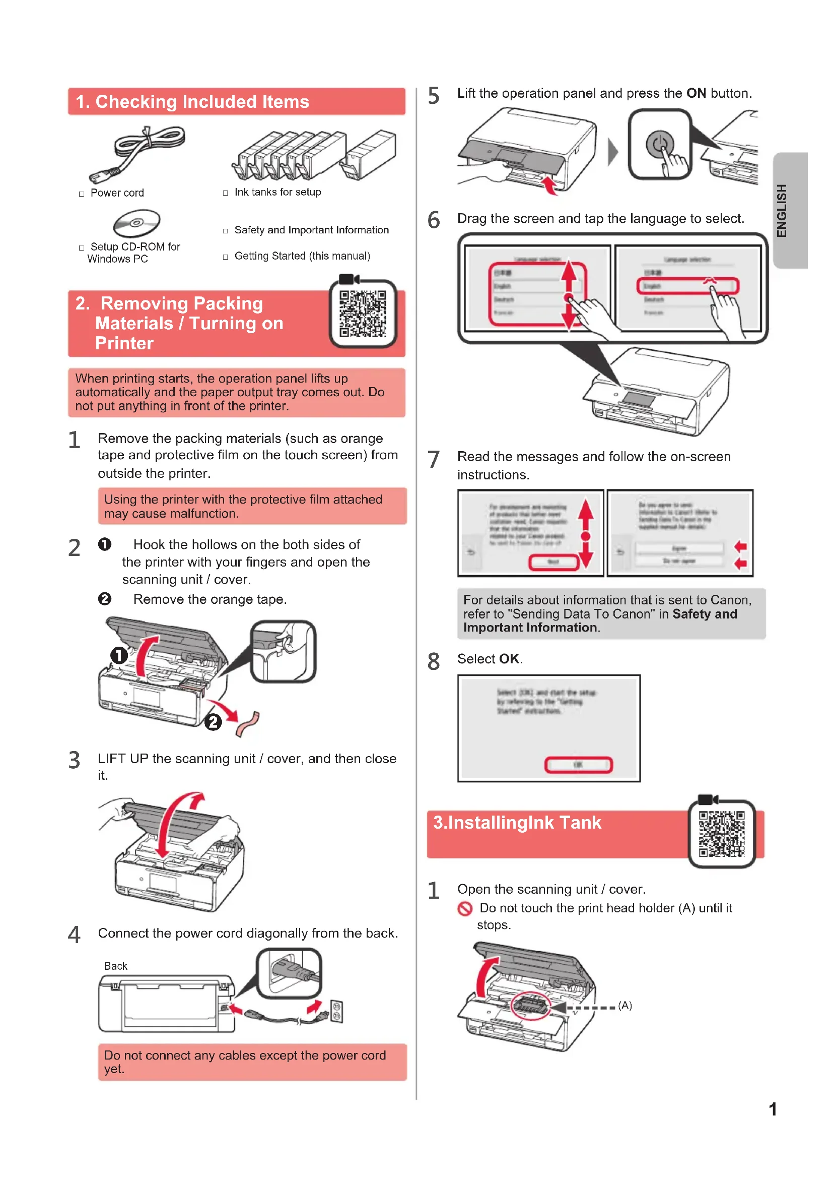 □ Setup CD-ROM for Windows PC□ Power cord□ Safety and Important Information□ Ink tanks for setup□ Getting Started (this manual)