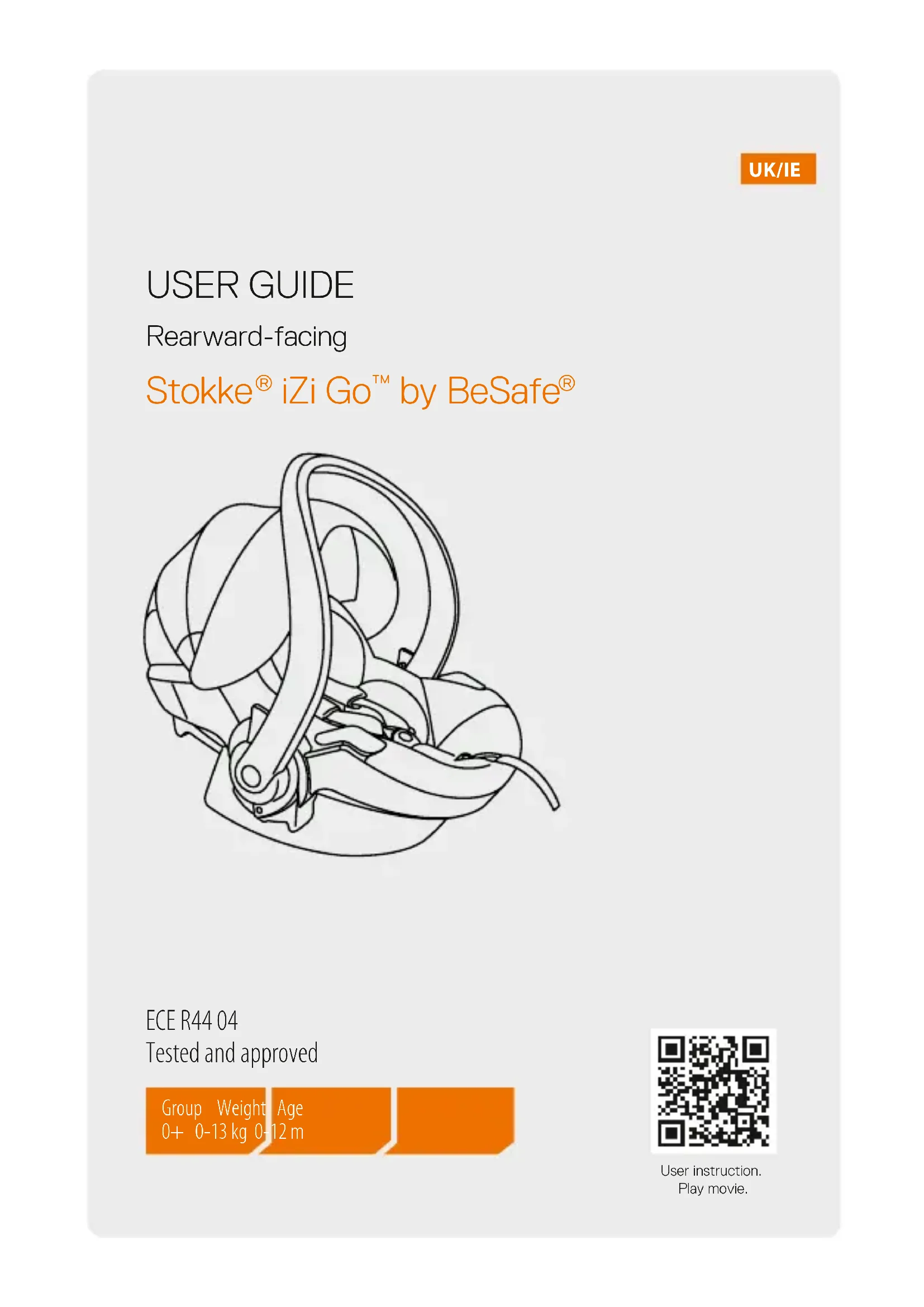 ECE R44 04 Tested and approved Group Weight Age 0+ 0-13 kg 0-12 m UK/IE User instruction. Play movie.EN 12790-2009 Stokke® iZi Go™ by BeSafe® 4 UK/IE WARNING