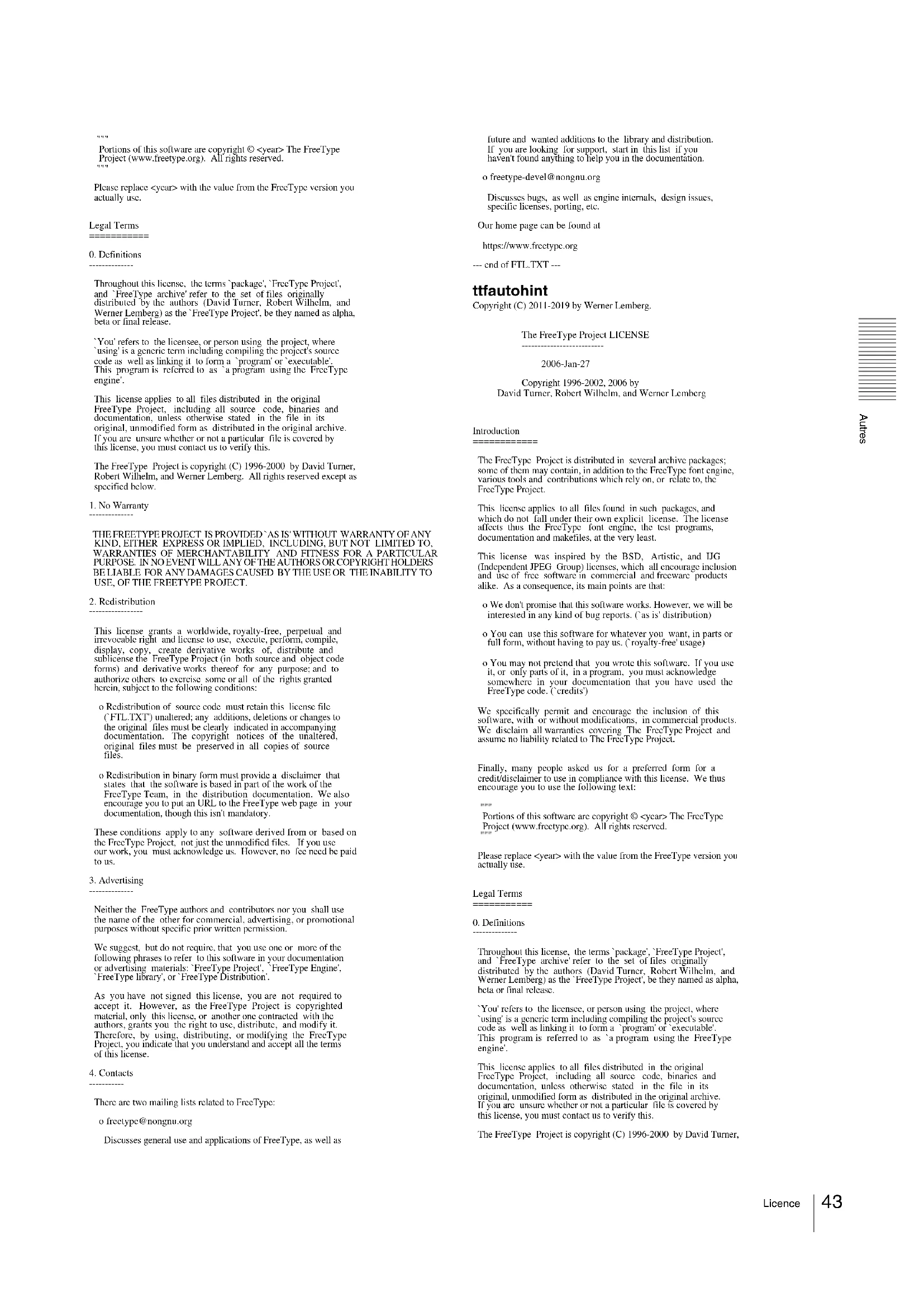 Throughout this license, the terms `package', `FreeType Project', and `FreeType archive' refer to the set of files originally distributed by the authors (David Turner, Robert Wilhelm, and Werner Lemberg) as the `FreeType Project', be they named as alpha, beta or final release. `You' refers to the licensee, or person using the project, where `using' is a generic term including compiling the project's source code as well as linking it to form a `program' or `executable'. This program is referred to as `a program using the FreeType engine'. This license applies to all files distributed in the original FreeType Project, including all source code, binaries and documentation, unless otherwise stated in the file in its original, unmodified form as distributed in the original archive. If you are unsure whether or not a particular file is covered by this license, you must contact us to verify this. The FreeType Project is copyright (C) 1996-2000 by David Turner,Autres Licence