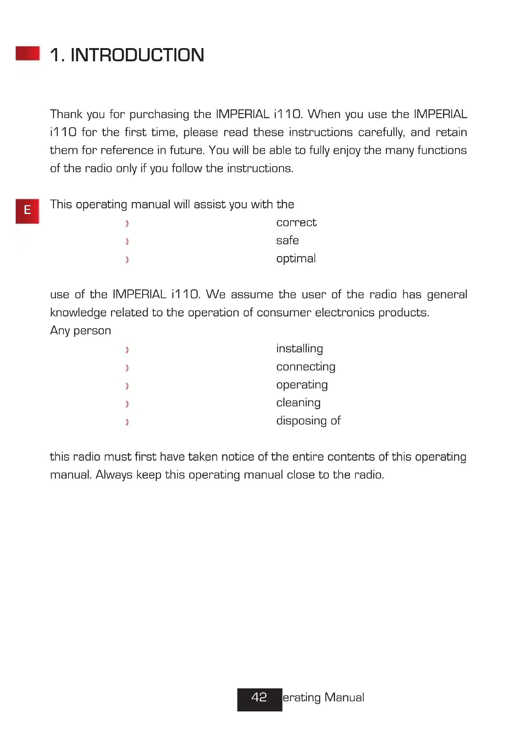 Thank you for purchasing the IMPERIAL i110. When you use the IMPERIAL i110 for the first time, please read these instructions carefully, and retain them for reference in future. You will be able to fully enjoy the many functions of the radio only if you follow the instructions. This operating manual will assist you with the › correct › safe › optimal use of the IMPERIAL i110. We assume the user of the radio has general knowledge related to the operation of consumer electronics products. Any person › installing › connecting › operating › cleaning › disposing of this radio must first have taken notice of the entire contents of this operating manual. Always keep this operating manual close to the radio.E 43 IMPERIAL