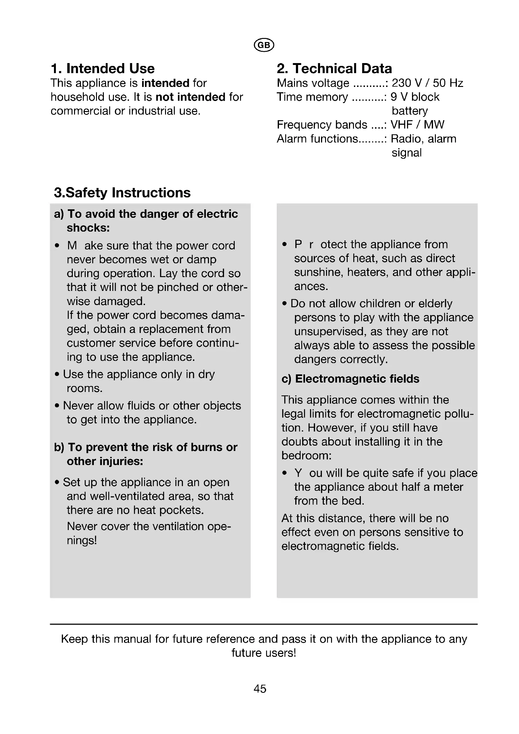 Mains voltage ..........: 230 V / 50 Hz Time memory ..........: 9 V block battery Frequency bands ....: VHF / MW Alarm functions........: Radio, alarm signal Keep this manual for future reference and pass it on with the appliance to any future users! 3.Safety Instructions a) To avoid the danger of electric shocks: