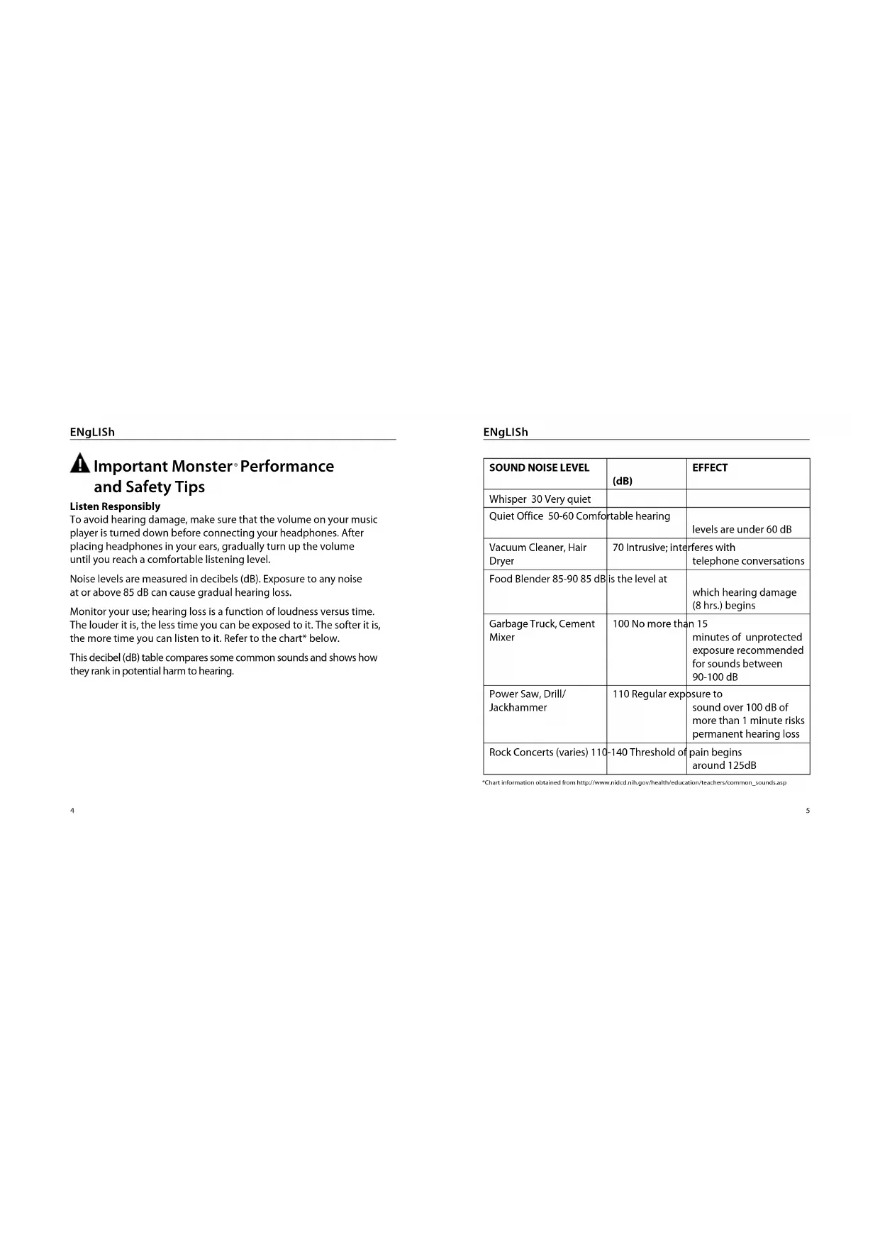| Garbage Truck, Cement Mixer | 100 No more than 15 minutes of unprotected exposure recommended for sounds between 90-100 dB | |