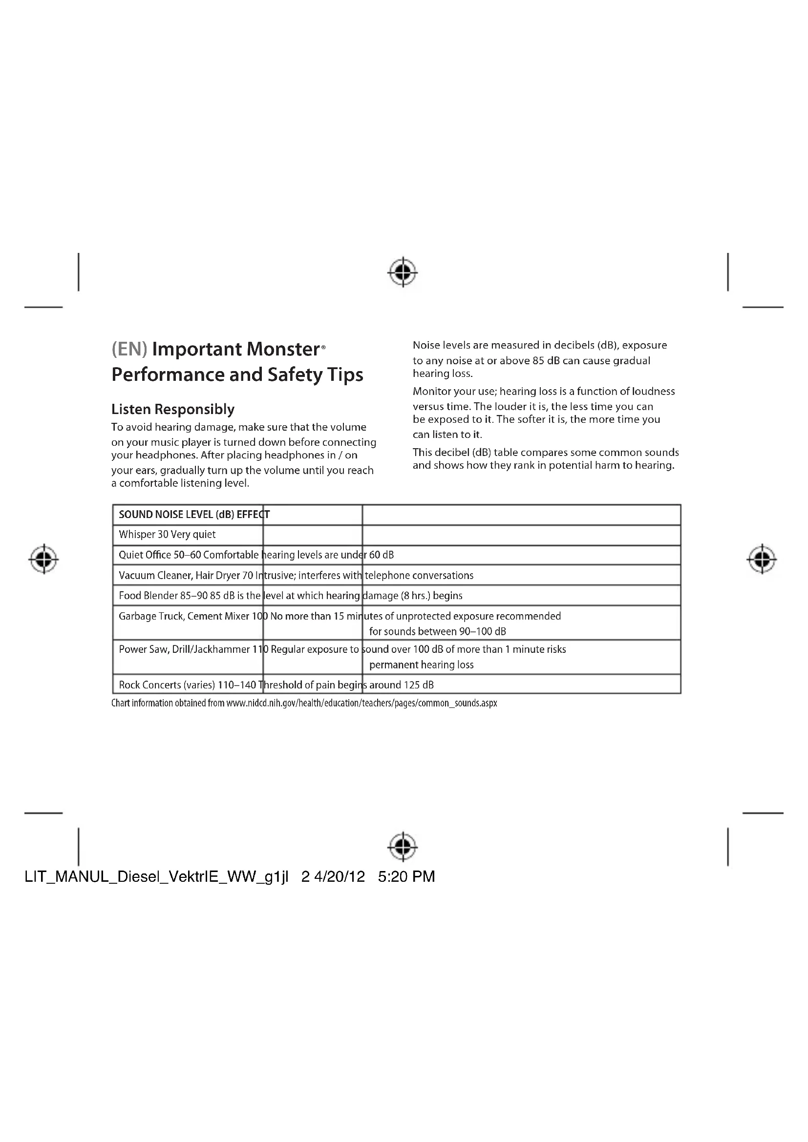 | SOUND NOISE LEVEL (dB) EFFECT | ||