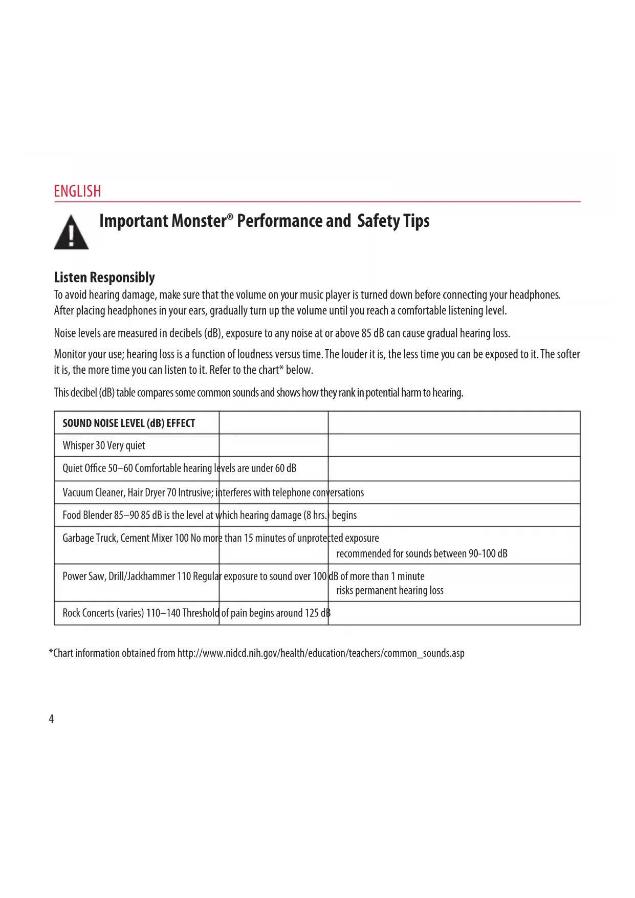 Listen Responsibly To avoid hearing damage, make sure that the volume on your music player is turned down before connecting your headphones. After placing headphones in your ears, gradually turn up the volume until you reach a comfortable listening level. Noise levels are measured in decibels (dB), exposure to any noise at or above 85 dB can cause gradual hearing loss. Monitor your use; hearing loss is a function of loudness versus time. The louder it is, the less time you can be exposed to it. The softer it is, the more time you can listen to it. Refer to the chart* below. This decibel (dB) table compares some common sounds and shows how they rank in potential harm to hearing. SOUND NOISE LEVEL (dB) EFFECTWhisper 30 Very quiet Quiet Oce 50–60 Comfortable hearing levels are under 60 dB Vacuum Cleaner, Hair Dryer 70 Intrusive; interferes with telephone conversationsFood Blender 85–90 85 dB is the level at which hearing damage (8 hrs.) beginsGarbage Truck, Cement Mixer 100 No more than 15 minutes of unprotected exposure recommended for sounds between 90-100 dBPower Saw, Drill/Jackhammer 110 Regular exposure to sound over 100 dB of more than 1 minute risks permanent hearing lossRock Concerts (varies) 110–140 Threshold of pain begins around 125 dB *Chart information obtained from http://www.nidcd.nih.gov/health/education/teachers/common_sounds.asp Important Monster® Performance and Safety TipsENGLISH