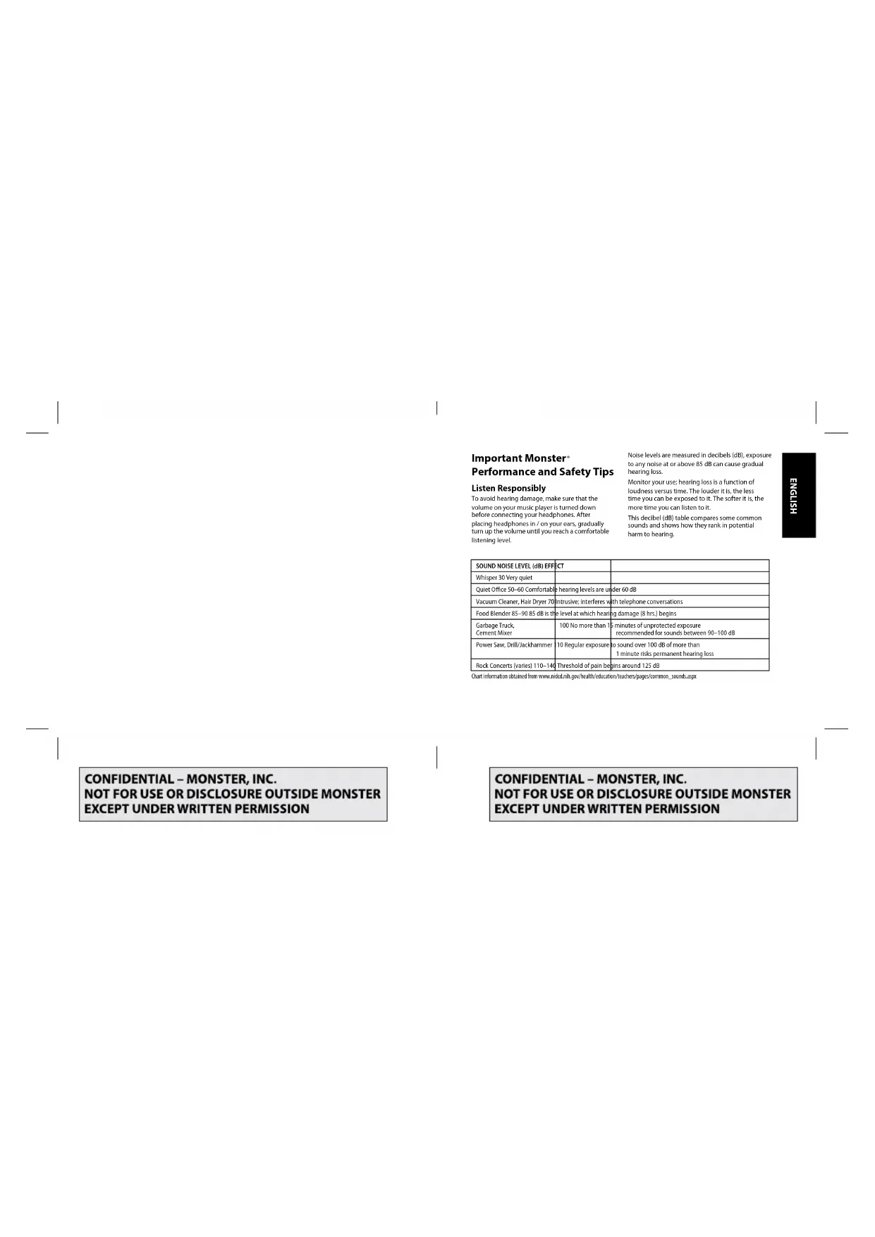 Performance and Safety Tips Listen Responsibly To avoid hearing damage, make sure that the volume on your music player is turned down before connecting your headphones. After placing headphones in / on your ears, gradually turn up the volume until you reach a comfortable listening level. Noise levels are measured in decibels (dB), exposure to any noise at or above 85 dB can cause gradual hearing loss. Monitor your use; hearing loss is a function of loudness versus time. The louder it is, the less time you can be exposed to it. The softer it is, the more time you can listen to it. This decibel (dB) table compares some common sounds and shows how they rank in potential harm to hearing. SOUND NOISE LEVEL (dB) EFFECT Whisper 30 Very quiet Quiet Oce 50–60 Comfortable hearing levels are under 60 dB Vacuum Cleaner, Hair Dryer 70 Intrusive; interferes with telephone conversations Food Blender 85–90 85 dB is the level at which hearing damage (8 hrs.) begins Garbage Truck, Cement Mixer 100 No more than 15 minutes of unprotected exposure recommended for sounds between 90–100 dB Power Saw, Drill/Jackhammer 110 Regular exposure to sound over 100 dB of more than 1 minute risks permanent hearing loss Rock Concerts (varies) 110–140 Threshold of pain begins around 125 dB Chart information obtained from www.nidcd.nih.gov/health/education/teachers/pages/common_sounds.aspx ENGLISHGet the most out of your equipment and enjoy great audio performance even at safe levels. Our headphones will allow you to hear more details at lower volume levels than ever before. Learn how to establish a safe listening level and review other important safety guidelines from the Consumer Electronics Association at www.ce.org. Important information on how to prevent Noise- Induced Hearing Loss (NIHL) and a comprehensive list of which noises can cause damage can be found on the Deafness Research Foundation’s website, www.drf.org. Physiology of the Ear and Hearing For additional information on what loud noises do to your ear and chart reference www.abelard.org/hear/hear.php#loud-music Use Responsibly Do not use headphones when it’s unsafe to do so – while operating a vehicle, riding a bike, crossing streets, or during any activity or in an environment where your full attention to your surroundings is required. It‘s dangerous to drive while wearing headphones, and in many places, illegal because it decreases your chances of hearing life-saving sounds outside of your vehicle, such as another car’s horn and emergency vehicle sirens. Please avoid wearing your headphones while driving. Use one of Monster’s FM transmitters to listen to your mobile media devices instead. Headphones “Break-in” Break in time for headphones? We’re kidding, right? No we’re not. Like any high performance product, whether it’s cars or headphones, they’re mechanical devices that settle in after use. Your new headphones will sound incredible out of the box, but will “mellow” out after use and sound even better. We recommend playing them for 8 hours. After 20 hours of playing, they should be fully broken in. Enjoy. Malleus Cochlear Nerve Stapes Tympanic Membrane Auditory Canal Cochlea Incus Vestibule To Nose/Throat Battery If applicable, battery must be recycled or disposed of properly. Information to consumers in application of EU WEEE Directive 96/2002 This product is subject to European Union regulations that promote the re-use and recycling of used electrical and electronic equipment. This product required the extraction and use of natural resources and may contain hazardous substances. The symbol above, on the product or on its packaging, indicates that this product must not be disposed of with your other household waste. Instead, it is your responsibility to dispose of your waste equipment by handing it over to a designated collection point for the recycling of waste electrical and electronic equipment. The separate collection and recycling of your waste equipment at the time of disposal will help to conserve natural resources and ensure that it is recycled in a manner that protects human health and the environment. For more information about where you can drop off your waste equipment for recycling, please contact your local city office, your household waste disposal service, or the store from which you purchased the product. For more information about Monster products, please visit us at: www.MonsterProducts.com. Monster