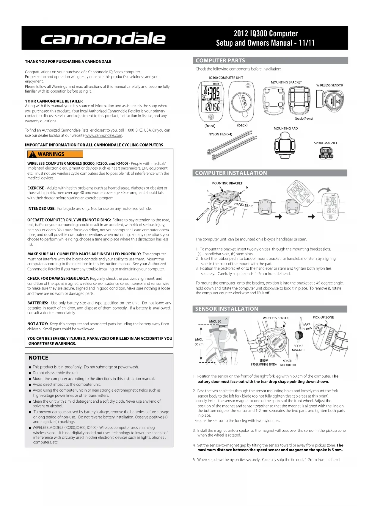 Along with this manual, your key source of information and assistance is the shop where you purchased this product. Your local Authorized Cannondale Retailer is your primary contact to discuss service and adjustment to this product, instruction in its use, and any warranty questions. To nd an Authorized Cannondale Retailer closest to you, call 1800BIKEUSA. Or you can use our dealer locator at our website www.cannondale.com. IMPORTANT INFORMATION FOR ALL CANNONDALE CYCLING COMPUTERS WARNINGS WIRELESS COMPUTER MODELS (IQ200, IQ300, and IQ400) - People with medical/ implanted electronic equipment or devices such as heart pacemakers, EKG equipment, etc. must not use wireless cycle computers due to possible risk of interference with the medical devices. EXERCISE - Adults with health problems (such as heart disease, diabetes or obesity) or those at high risk, men over age 40 and women over age 50 or pregnant should talk with their doctor before starting an exercise program. INTENDED USE: For bicycle use only. Not for use on any motorized vehicle. OPERATE COMPUTER ONLY WHEN NOT RIDING: Failure to pay attention to the road, trail, trac or your surroundings could result in an accident, with risk of serious injury, paralysis or death. You must focus on riding, not your computer. Learn computer opera- tions, and do all possible computer operations when not riding. For any operations you choose to perform while riding, choose a time and place where this distraction has less risk. MAKE SURE ALL COMPUTER PARTS ARE INSTALLED PROPERLY: The computer must not interfere with the bicycle controls and your ability to use them. Mount the computer according to the directions in this instruction manual. See your Authorized Cannondale Retailer if you have any trouble installing or maintaining your computer. CHECK FOR DAMAGE REGULARLY: Regularly check the position, alignment, and condition of the spoke magnet, wireless sensor, cadence sensor, sensor and sensor wire to make sure they are secure, aligned and in good condition. Make sure nothing is loose and there are no worn or damaged parts. BATTERIES: Use only battery size and type specied on the unit. Do not leave any batteries in reach of children, and dispose of them correctly. If a battery is swallowed, consult a doctor immediately. NOT A TOY: Keep this computer and associated parts including the battery away from children. Small parts could be swallowed. YOU CAN BE SEVERELY INJURED, PARALYZED OR KILLED IN AN ACCIDENT IF YOU IGNORE THESE WARNINGS. NOTICE ■ This product is rain-proof only. Do not submerge or power wash. ■ Do not disassemble the unit. ■ Mount the computer according to the directions in this instruction manual. ■ Avoid direct impact to the computer unit. ■ Avoid using the computer unit in or near strong electromagnetic elds such as high-voltage power lines or other transmitters. ■ Clean the unit with a mild detergent and a soft dry cloth. Never use any kind of solvent or alcohol. ■ To prevent damage caused by battery leakage, remove the batteries before storage or long period of non-use. Do not reverse battery installation. Observe positive (+) and negative (-) markings. ■ WIRELESS MODELS (IQ200,IQ300, IQ400) Wireless computer uses an analog wireless signal. It is not digitally coded but uses technology to lower the chance of interference with circuitry used in other electronic devices such as lights, phones , computers, etc. 2012 IQ300 Computer Setup and Owners Manual - 11/11 COMPUTER PARTS COMPUTER INSTALLATION The computer unit can be mounted on a bicycle handlebar or stem.