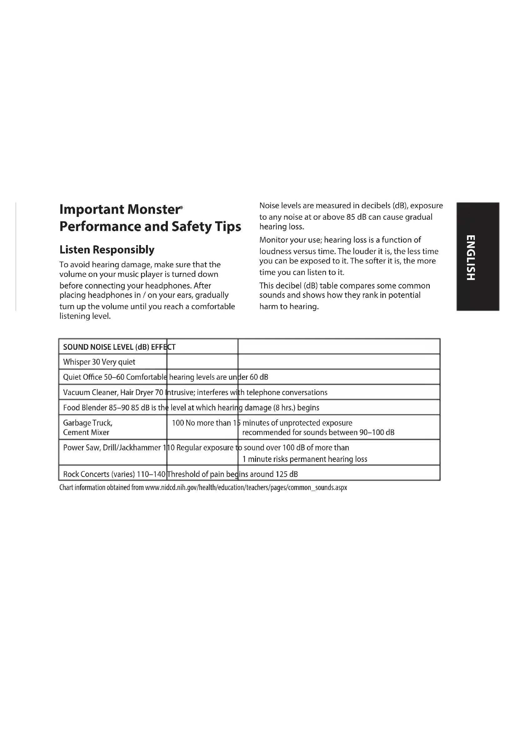 Performance and Safety Tips Listen Responsibly To avoid hearing damage, make sure that the volume on your music player is turned down before connecting your headphones. After placing headphones in / on your ears, gradually turn up the volume until you reach a comfortable listening level. Noise levels are measured in decibels (dB), exposure to any noise at or above 85 dB can cause gradual hearing loss. Monitor your use; hearing loss is a function of loudness versus time. The louder it is, the less time you can be exposed to it. The softer it is, the more time you can listen to it. This decibel (dB) table compares some common sounds and shows how they rank in potential harm to hearing. SOUND NOISE LEVEL (dB) EFFECT Whisper 30 Very quiet Quiet Oce 50–60 Comfortable hearing levels are under 60 dB Vacuum Cleaner, Hair Dryer 70 Intrusive; interferes with telephone conversations Food Blender 85–90 85 dB is the level at which hearing damage (8 hrs.) begins Garbage Truck, Cement Mixer 100 No more than 15 minutes of unprotected exposure recommended for sounds between 90–100 dB Power Saw, Drill/Jackhammer 110 Regular exposure to sound over 100 dB of more than 1 minute risks permanent hearing loss Rock Concerts (varies) 110–140 Threshold of pain begins around 125 dB Chart information obtained from www.nidcd.nih.gov/health/education/teachers/pages/common_sounds.aspx ENGLISHGet the most out of your equipment and enjoy great audio performance even at safe levels. Our headphones will allow you to hear more details at lower volume levels than ever before. Learn how to establish a safe listening level and review other important safety guidelines from the Consumer Electronics Association at www.ce.org. Important information on how to prevent Noise- Induced Hearing Loss (NIHL) and a comprehensive list of which noises can cause damage can be found on the Deafness Research Foundation’s website, www.drf.org. Physiology of the Ear and Hearing For additional information on what loud noises do to your ear and more on protecting the ear, reference www.abelard.org/hear/hear. php#loud-music Use Responsibly Do not use headphones when it’s unsafe to do so – while operating a vehicle, riding a bike, crossing streets, or during any activity or in an environment where your full attention to your surroundings is required. It‘s dangerous to drive while wearing headphones, and in many places, illegal because it decreases your chances of hearing life-saving sounds outside of your vehicle, such as another car’s horn and emergency vehicle sirens. Please avoid wearing your headphones while driving. Use one of Monster’s FM transmitters to listen to your mobile media devices instead. Headphones “Break-in” Break in time for headphones? We’re kidding, right? No we’re not. Like any high performance product, whether it’s cars or headphones, they’re mechanical devices that settle in after use. Your new headphones will sound incredible out of the box, but will “mellow” out after use and sound even better. We recommend playing them for 8 hours. After 20 hours of playing, they should be fully broken in. Enjoy. Battery If applicable, battery must be recycled or disposed of properly. Incus Cochlear Nerve Stapes Tympanic Membrane Auditory Canal Cochlea Malleus Vestibule To Nose/Throat ENGLISHInformation to consumers in application of EU WEEE Directive 96/2002 This product is subject to European Union regulations that promote the re-use and recycling of used electrical and electronic equipment. This product required the extraction and use of natural resources and may contain hazardous substances. The symbol above, on the product or on its packaging, indicates that this product must not be disposed of with your other household waste. Instead, it is your responsibility to dispose of your waste equipment by handing it over to a designated collection point for the recycling of waste electrical and electronic equipment. The separate collection and recycling of your waste equipment at the time of disposal will help to conserve natural resources and ensure that it is recycled in a manner that protects human health and the environment. For more information about where you can drop o your waste equipment for recycling, please contact your local city oce, your household waste disposal service, or the store from which you purchased the product. For more information about Monster products, please visit us at: www.MonsterProducts.com. Monster