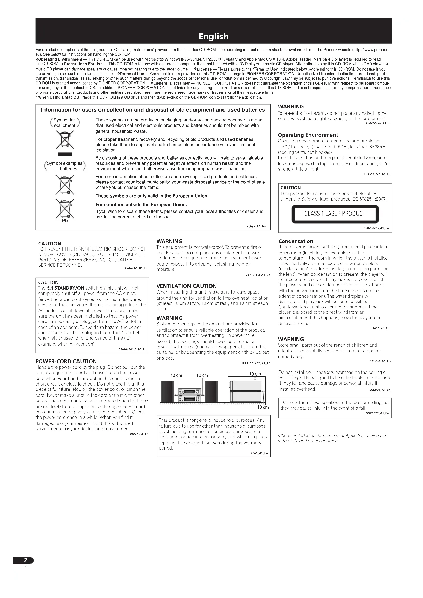 CAUTION The /I STANDBY/ON switch on this unit will not completely shut off all power from the AC outlet. Since the power cord serves as the main disconnect device for the unit, you will need to unplug it from the AC outlet to shut down all power. Therefore, make sure the unit has been installed so that the power cord can be easily unplugged from the AC outlet in case of an accident. To avoid fire hazard, the power cord should also be unplugged from the AC outlet when left unused for a long period of time (for example, when on vacation). D3-4-2-2-2a*_A1_En WARNING This equipment is not waterproof. To prevent a fire or shock hazard, do not place any container filled with liquid near this equipment (such as a vase or flower pot) or expose it to dripping, splashing, rain or moisture. D3-4-2-1-3_A1_En This product is for general household purposes. Any failure due to use for other than household purposes (such as long-term use for business purposes in a restaurant or use in a car or ship) and which requires repair will be charged for even during the warranty period. K041_A1_En POWER-CORD CAUTION Handle the power cord by the plug. Do not pull out the plug by tugging the cord and never touch the power cord when your hands are wet as this could cause a short circuit or electric shock. Do not place the unit, a piece of furniture, etc., on the power cord, or pinch the cord. Never make a knot in the cord or tie it with other cords. The power cords should be routed such that they are not likely to be stepped on. A damaged power cord can cause a fire or give you an electrical shock. Check the power cord once in a while. When you find it damaged, ask your nearest PIONEER authorized service center or your dealer for a replacement.S002*_A1_En WARNING To prevent a fire hazard, do not place any naked flame sources (such as a lighted candle) on the equipment. D3-4-2-1-7a_A1_En Operating Environment Operating environment temperature and humidity:+5 °C to +35 °C (+41 °F to +95 °F); less than 85 %RH (cooling vents not blocked)Do not install this unit in a poorly ventilated area, or in locations exposed to high humidity or direct sunlight (or strong artificial light)D3-4-2-1-7c*_A1_En CAUTION This product is a class 1 laser product classified under the Safety of laser products, IEC 60825-1:2007.