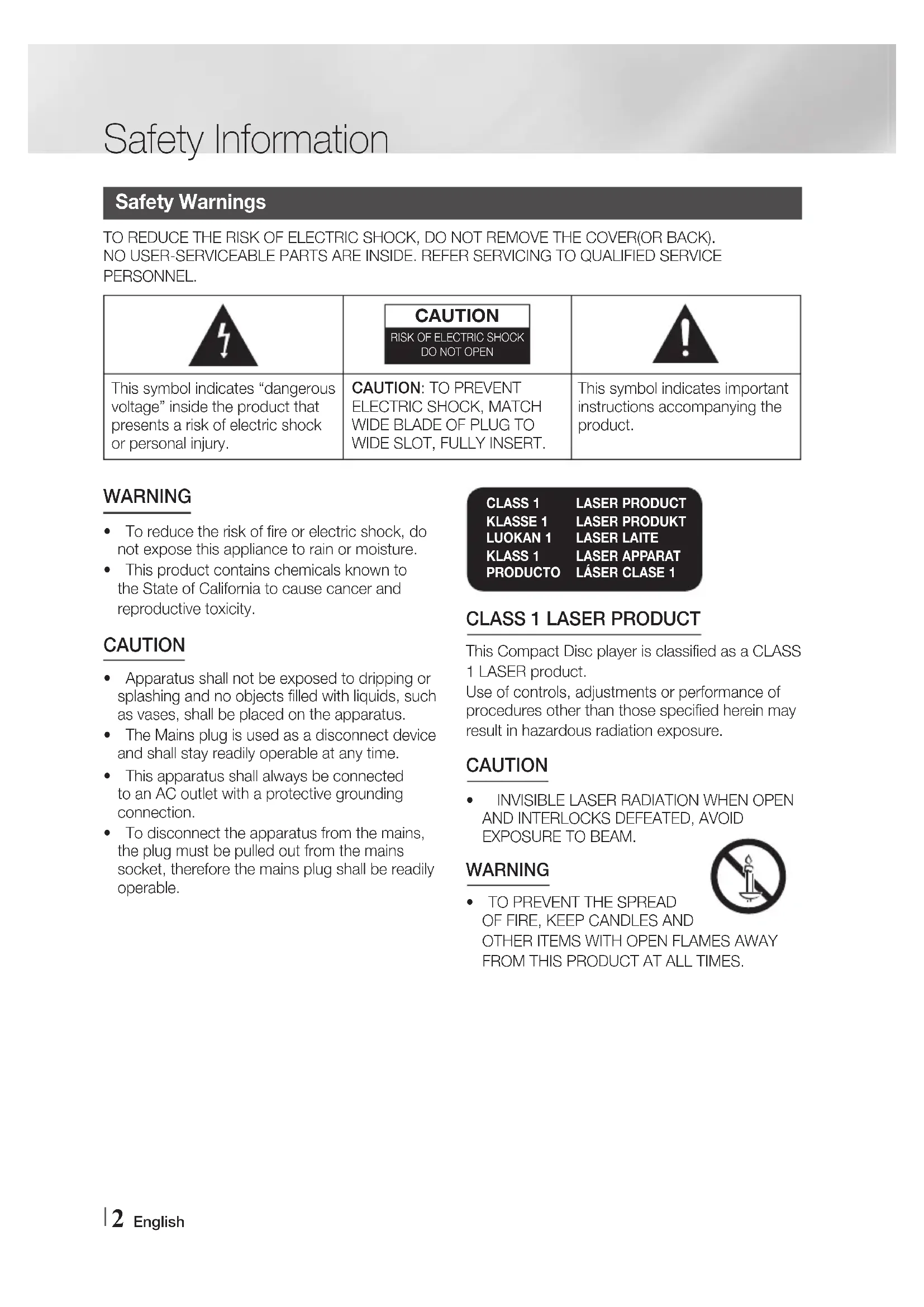 - INVISIBLE LASER RADIATION WHEN OPEN AND INTERLOCKS DEFEATED, AVOID EXPOSURE TO BEAM.WARNING• TO PREVENT THE SPREAD OF FIRE, KEEP CANDLES AND OTHER ITEMS WITH OPEN FLAMES AWAY FROM THIS PRODUCT AT ALL TIMES.02876F-MM-J430D-EN-ENG-0630.indd 2 2015/7/3 13:44:05English 3