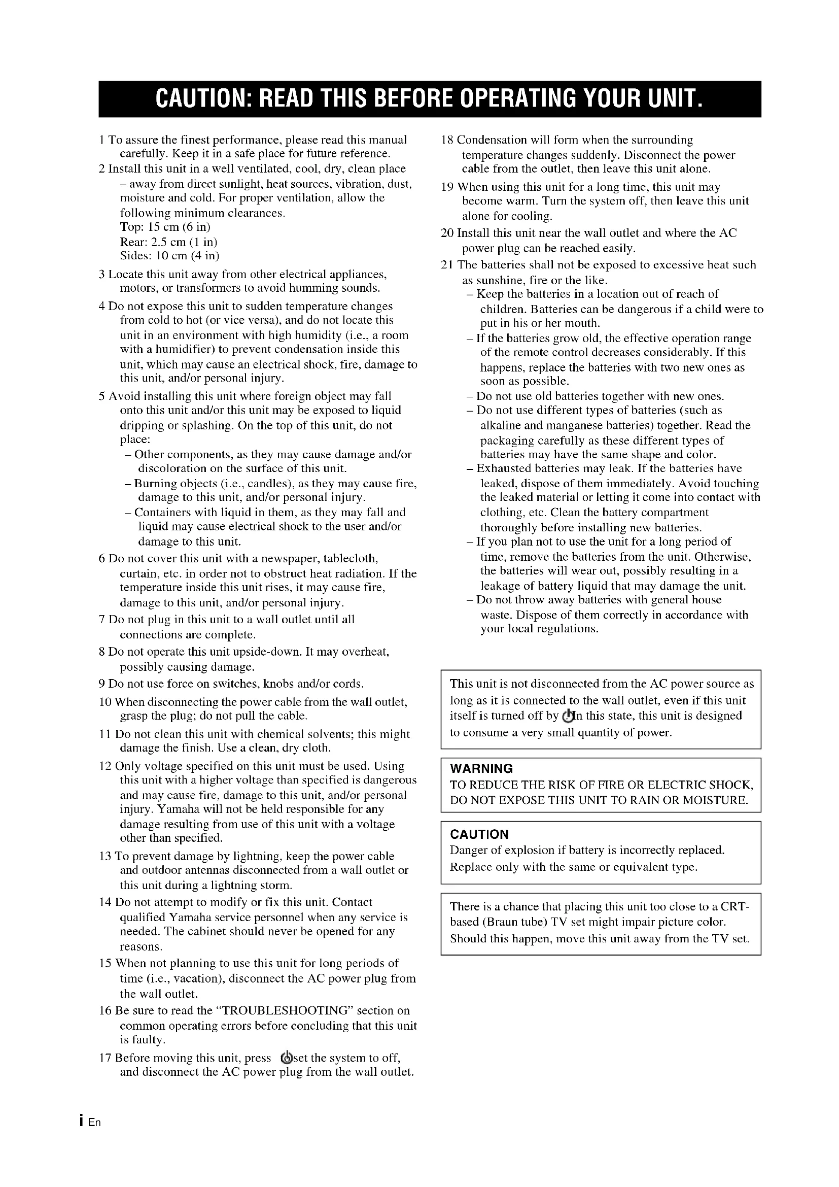 GEBRUIKSAANWIJZING ИНСТРУКЦИЯ ПО ЭКСПЛУАТАЦИИi En 1 To assure the finest performance, please read this manual carefully. Keep it in a safe place for future reference. 2 Install this unit in a well ventilated, cool, dry, clean place – away from direct sunlight, heat sources, vibration, dust, moisture and cold. For proper ventilation, allow the following minimum clearances. Top: 15 cm (6 in) Rear: 2.5 cm (1 in) Sides: 10 cm (4 in) 3 Locate this unit away from other electrical appliances, motors, or transformers to avoid humming sounds. 4 Do not expose this unit to sudden temperature changes from cold to hot (or vice versa), and do not locate this unit in an environment with high humidity (i.e., a room with a humidifier) to prevent condensation inside this unit, which may cause an electrical shock, fire, damage to this unit, and/or personal injury. 5 Avoid installing this unit where foreign object may fall onto this unit and/or this unit may be exposed to liquid dripping or splashing. On the top of this unit, do not place: – Other components, as they may cause damage and/or discoloration on the surface of this unit. – Burning objects (i.e., candles), as they may cause fire, damage to this unit, and/or personal injury. – Containers with liquid in them, as they may fall and liquid may cause electrical shock to the user and/or damage to this unit. 6 Do not cover this unit with a newspaper, tablecloth, curtain, etc. in order not to obstruct heat radiation. If the temperature inside this unit rises, it may cause fire, damage to this unit, and/or personal injury. 7 Do not plug in this unit to a wall outlet until all connections are complete. 8 Do not operate this unit upside-down. It may overheat, possibly causing damage. 9 Do not use force on switches, knobs and/or cords. 10 When disconnecting the power cable from the wall outlet, grasp the plug; do not pull the cable. 11 Do not clean this unit with chemical solvents; this might damage the finish. Use a clean, dry cloth. 12 Only voltage specified on this unit must be used. Using this unit with a higher voltage than specified is dangerous and may cause fire, damage to this unit, and/or personal injury. Yamaha will not be held responsible for any damage resulting from use of this unit with a voltage other than specified. 13 To prevent damage by lightning, keep the power cable and outdoor antennas disconnected from a wall outlet or this unit during a lightning storm. 14 Do not attempt to modify or fix this unit. Contact qualified Yamaha service personnel when any service is needed. The cabinet should never be opened for any reasons. 15 When not planning to use this unit for long periods of time (i.e., vacation), disconnect the AC power plug from the wall outlet. 16 Be sure to read the “TROUBLESHOOTING” section on common operating errors before concluding that this unit is faulty. 17 Before moving this unit, press to set the system to off, and disconnect the AC power plug from the wall outlet. 18 Condensation will form when the surrounding temperature changes suddenly. Disconnect the power cable from the outlet, then leave this unit alone. 19 When using this unit for a long time, this unit may become warm. Turn the system off, then leave this unit alone for cooling. 20 Install this unit near the wall outlet and where the AC power plug can be reached easily. 21 The batteries shall not be exposed to excessive heat such as sunshine, fire or the like. – Keep the batteries in a location out of reach of children. Batteries can be dangerous if a child were to put in his or her mouth. – If the batteries grow old, the effective operation range of the remote control decreases considerably. If this happens, replace the batteries with two new ones as soon as possible. – Do not use old batteries together with new ones. – Do not use different types of batteries (such as alkaline and manganese batteries) together. Read the packaging carefully as these different types of batteries may have the same shape and color. – Exhausted batteries may leak. If the batteries have leaked, dispose of them immediately. Avoid touching the leaked material or letting it come into contact with clothing, etc. Clean the battery compartment thoroughly before installing new batteries. – If you plan not to use the unit for a long period of time, remove the batteries from the unit. Otherwise, the batteries will wear out, possibly resulting in a leakage of battery liquid that may damage the unit. – Do not throw away batteries with general house waste. Dispose of them correctly in accordance with your local regulations. CAUTION: READ THIS BEFORE OPERATING YOUR UNIT. This unit is not disconnected from the AC power source as long as it is connected to the wall outlet, even if this unit itself is turned off by . In this state, this unit is designed to consume a very small quantity of power. WARNING TO REDUCE THE RISK OF FIRE OR ELECTRIC SHOCK, DO NOT EXPOSE THIS UNIT TO RAIN OR MOISTURE. CAUTION Danger of explosion if battery is incorrectly replaced. Replace only with the same or equivalent type. There is a chance that placing this unit too close to a CRT- based (Braun tube) TV set might impair picture color. Should this happen, move this unit away from the TV set.1 En English Français Deutsch Svenska Italiano Español Nederlands Русский