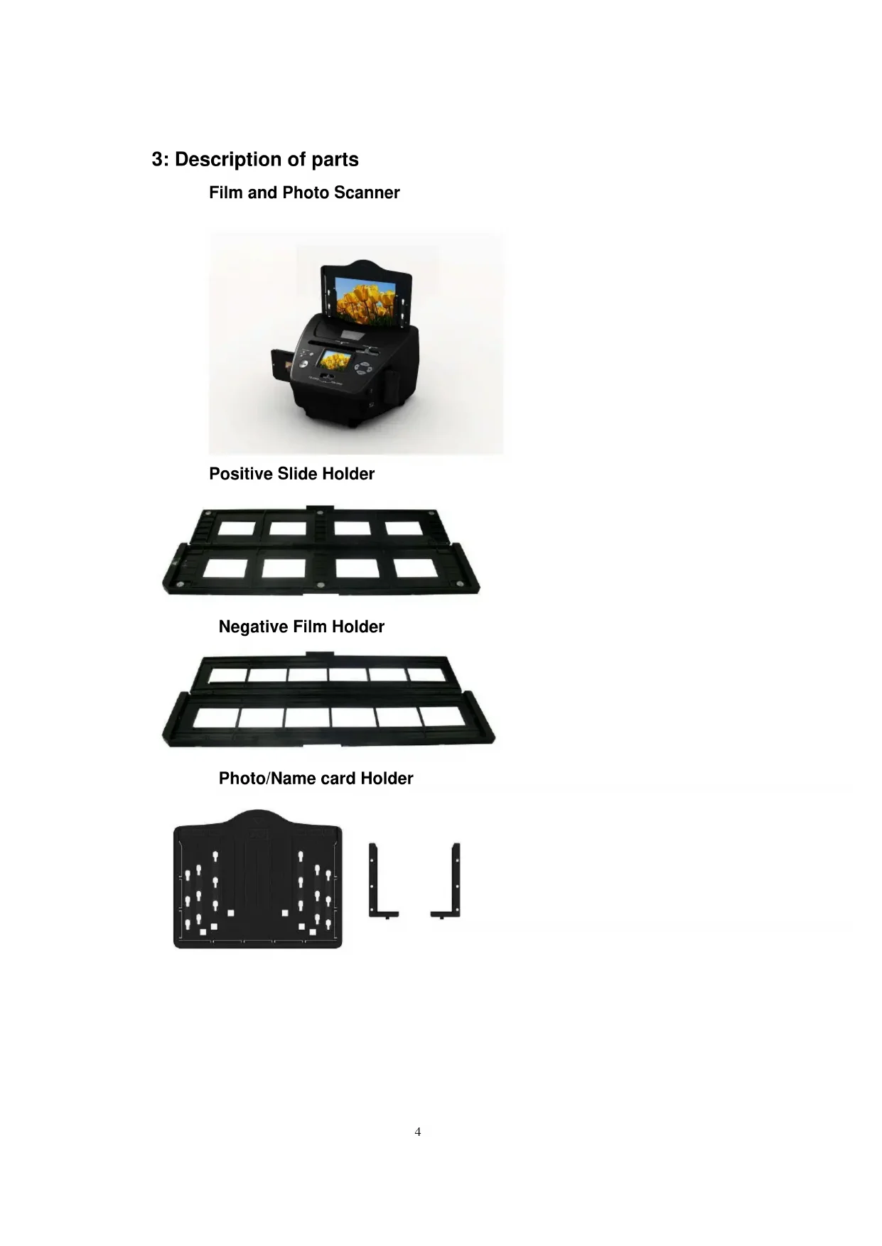 Please remove the adaptor from the mains when not in use.4 3: Description of parts Film and Photo Scanner