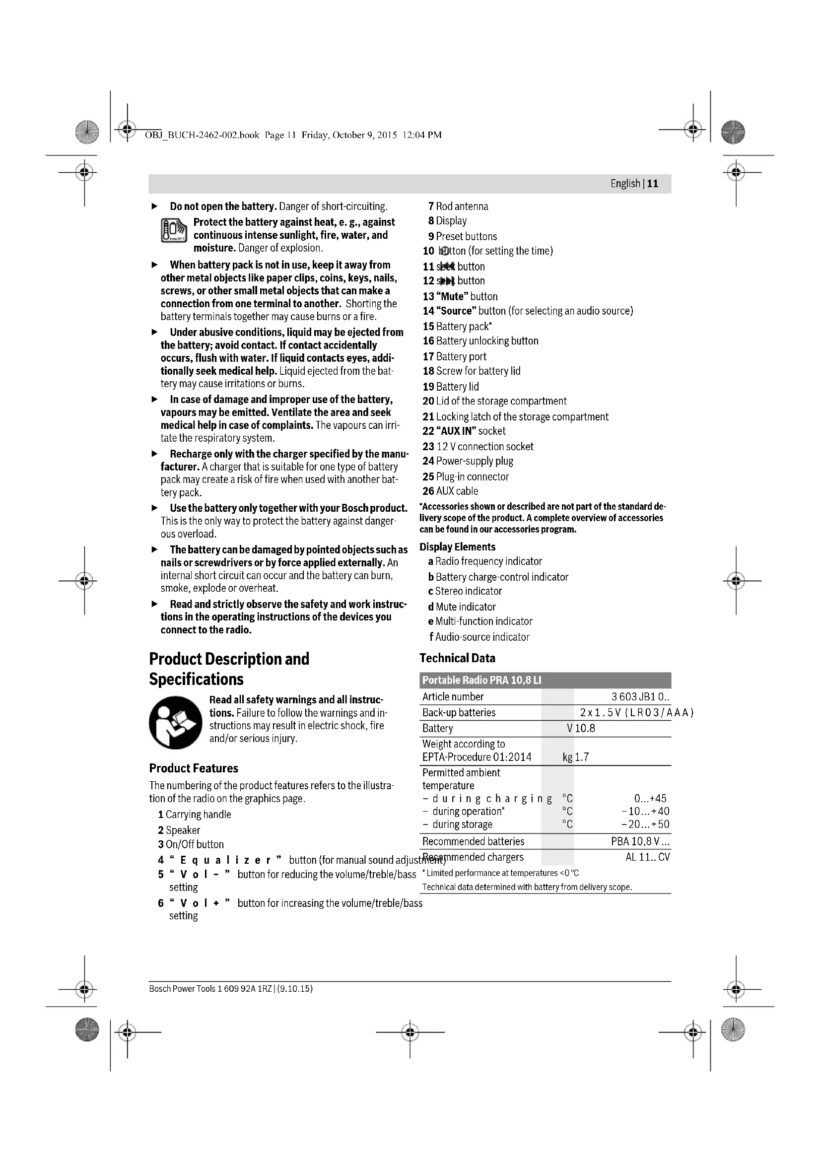 - Limited performance at temperatures <0 °CTechnical data determined with battery from delivery scope. OBJ_BUCH-2462-002.book Page 11 Friday, October 9, 2015 12:04 PM12 | English 1 609 92A 1RZ | (9.10.15) Bosch Power Tools Assembly Power Supply of Radio The radio can be powered using the power-supply plug 24 or using a Li-Ion battery 15. Operation with Battery Pack Note: The use of batteries unsuitable for your radio can lead to malfunction or damage to the radio. Note: The battery pack is supplied partially charged. To en- sure full capacity of the battery pack, completely charge the battery pack in the battery charger before using for the first time. Use only the chargers listed in the technical data. Only these chargers are matched to the lithium-ion battery of your radio. The lithium-ion battery can be charged at any time without reducing its service life. Interrupting the charging procedure does not damage the battery. Insert a battery into the battery port 17 in such a manner that the connections of the battery face against the connections in the battery port 17, and allow the battery to engage in the battery port. The battery charge-control indicator b appears on the display as soon as a battery with sufficient voltage is inserted and the radio is not connected to the mains by the power-supply plug