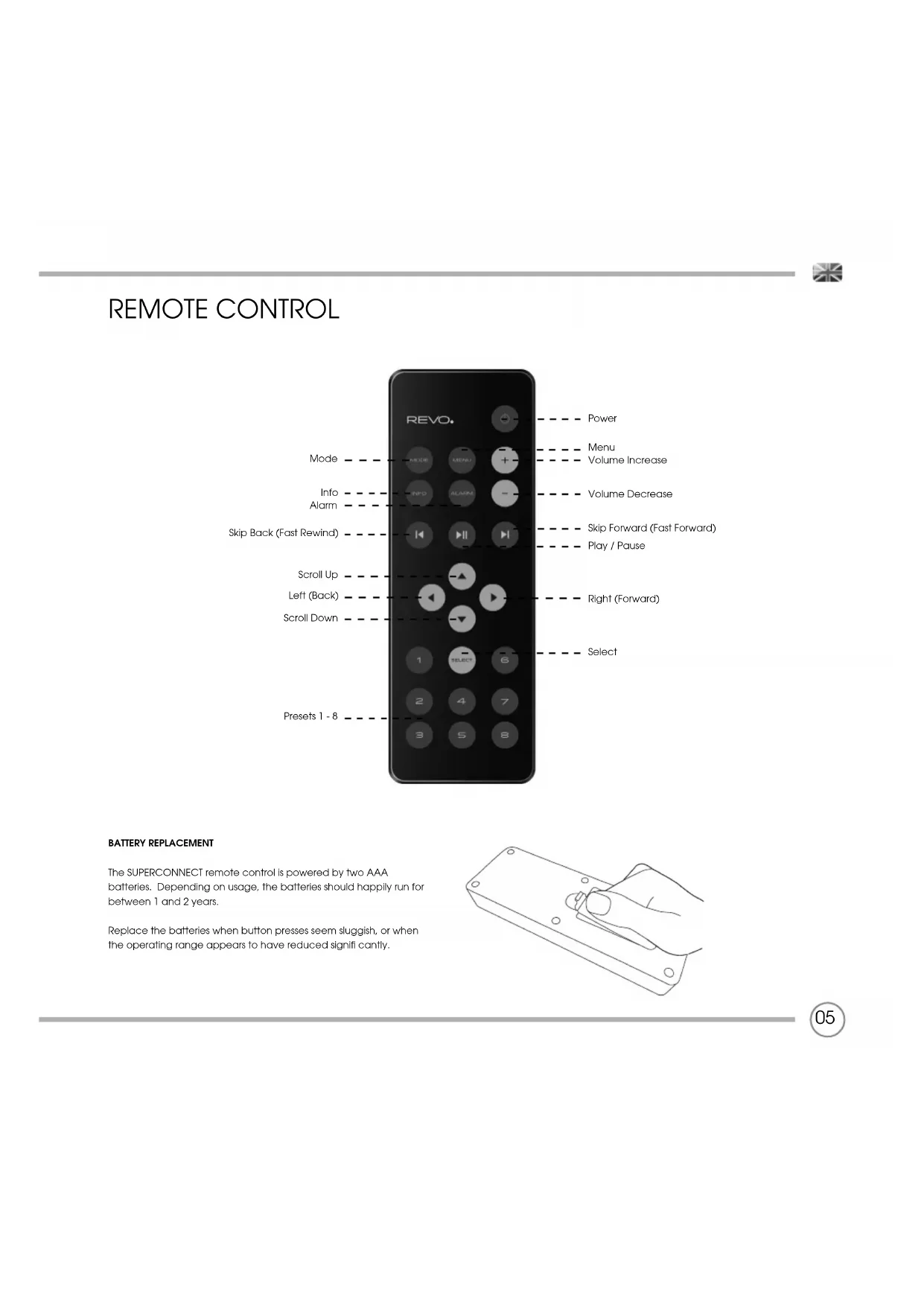 04REMOTE CONTROL BATTERY REPLACEMENT The SUPERCONNECT remote control is powered by two AAA batteries. Depending on usage, the batteries should happily run for between 1 and 2 years. Replace the batteries when button presses seem sluggish, or when the operating range appears to have reduced signifi cantly.