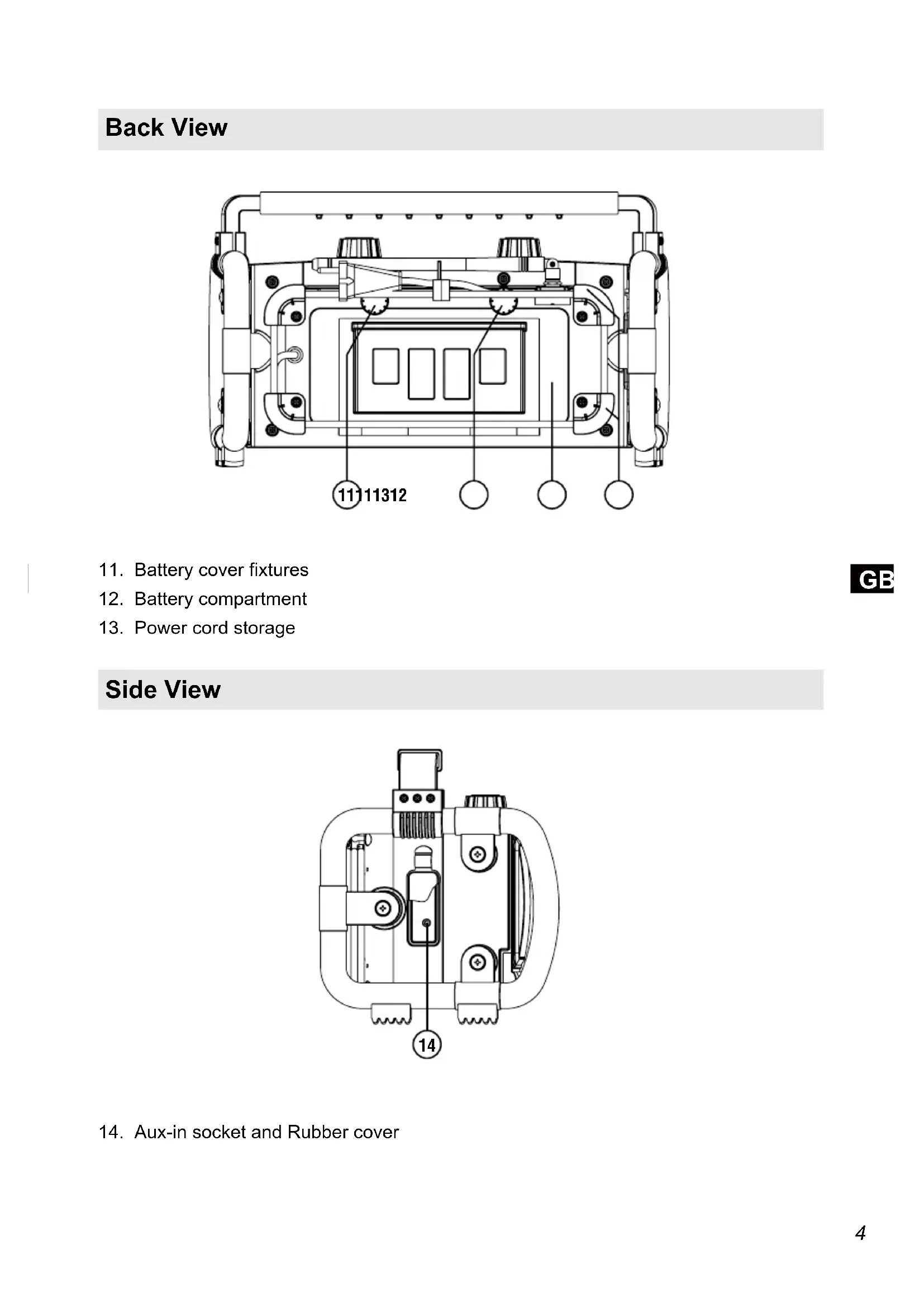 Note: Make sure the rubber cover is closed well after use to prevent moist and dirt from entering the radio. TECHNICAL SPECIFICATIONS Power Supply: Mains operation AC 230V, 50Hz ~ only Batteries operation 6 x 1.5V (Type IEC LR20 / UM-1 / D size) Frequency Coverage: FM 87.5 – 108MHz Speaker: Size 2 x Ø4 inch Impedance 16 ohms Output power 2 x 5W Aux In socket Ø3.5 mm Environmental note: This product has been made from high-quality parts and materials which can be reused and recycled. Therefore, do not throw the product away with normal household waste at the end of its life. Take it to a collection point for recycling electrical and electronic device. This is indicated by this symbol on the product, in the operating manual and on the packaging. Please nd out about collection points operated by your local authority. Help protect the environmental by recycling used products.
