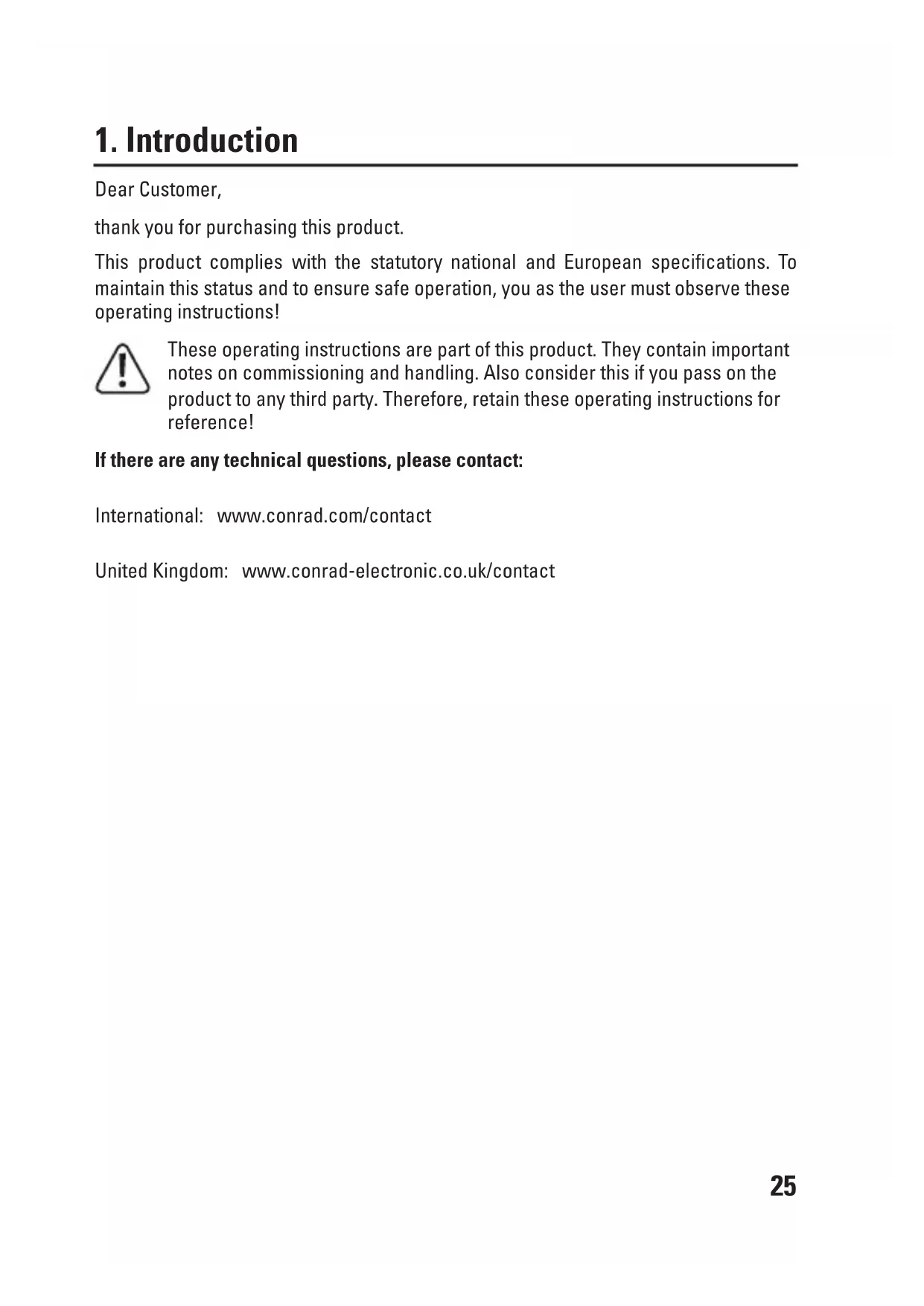 Dear Customer, thank you for purchasing this product. This product complies with the statutory national and European specifications. To maintain this status and to ensure safe operation, you as the user must observe these operating instructions! These operating instructions are part of this product. They contain important notes on commissioning and handling. Also consider this if you pass on the product to any third party. Therefore, retain these operating instructions for reference! If there are any technical questions, please contact: International: www.conrad.com/contact United Kingdom: www.conrad-electronic.co.uk/contact2626