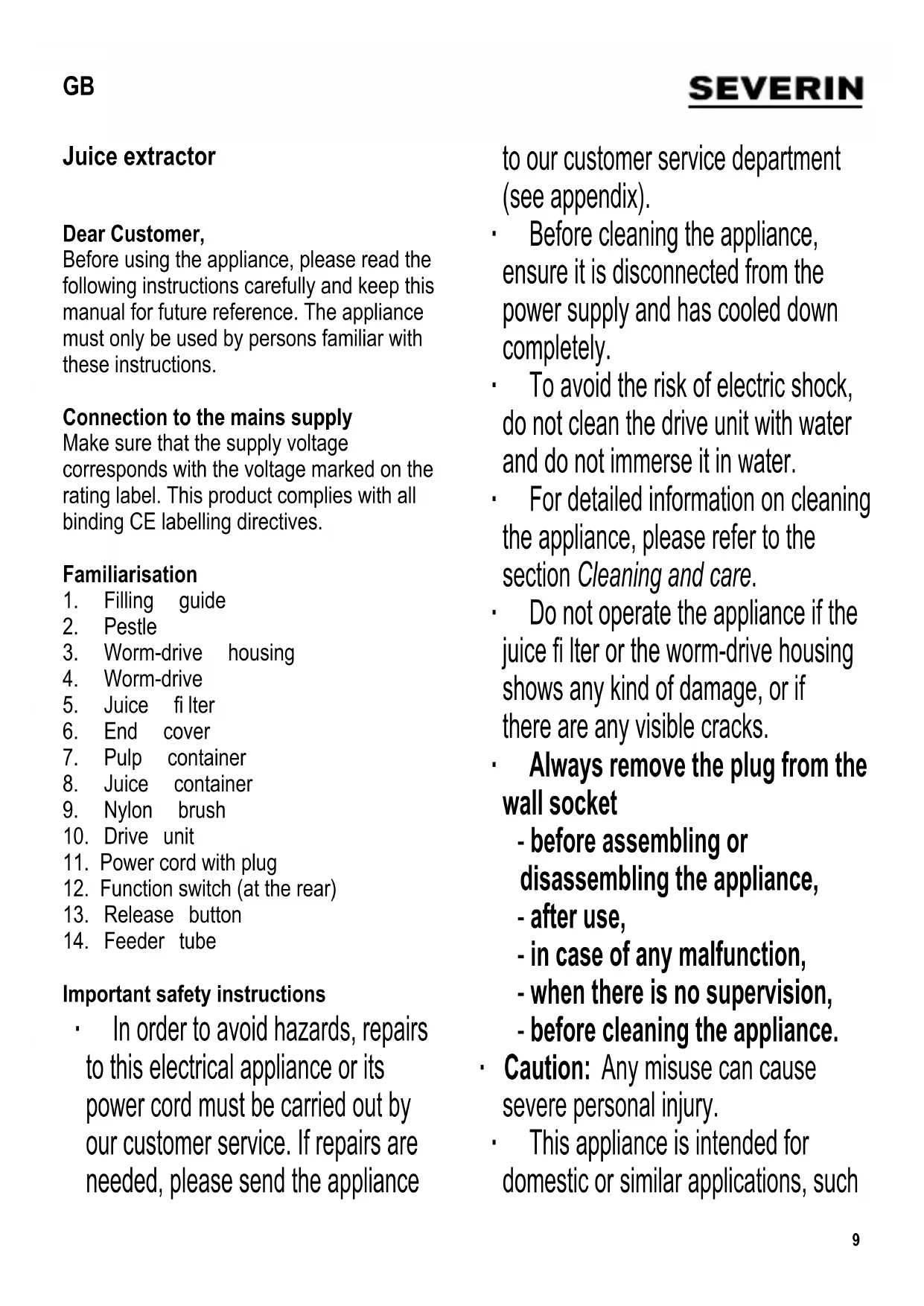 Important safety instructions ∙ In order to avoid hazards, repairs to this electrical appliance or its power cord must be carried out by our customer service. If repairs are needed, please send the appliance to our customer service department (see appendix). ∙ Before cleaning the appliance, ensure it is disconnected from the power supply and has cooled down completely. ∙ To avoid the risk of electric shock, do not clean the drive unit with water and do not immerse it in water. ∙ For detailed information on cleaning the appliance, please refer to the section Cleaning and care. ∙ Do not operate the appliance if the juice fi lter or the worm-drive housing shows any kind of damage, or if there are any visible cracks. ∙ Always remove the plug from the wall socket - before assembling or disassembling the appliance, - after use, - in case of any malfunction, - when there is no supervision, - before cleaning the appliance. ∙ Caution: Any misuse can cause severe personal injury. ∙ This appliance is intended for domestic or similar applications, such GB10