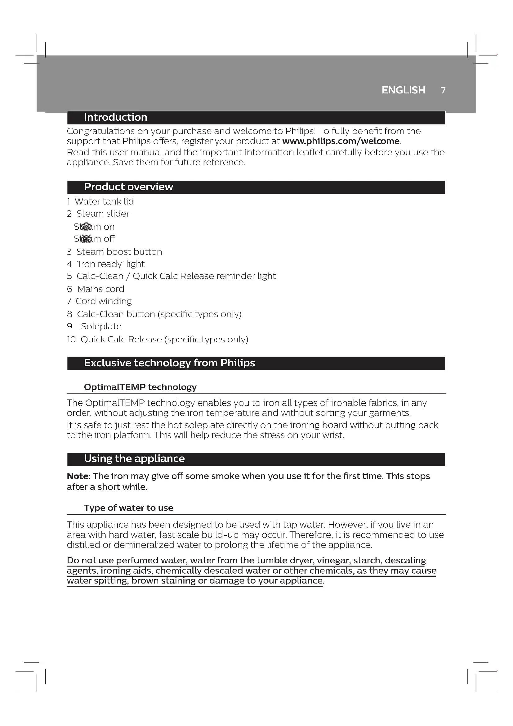 1-4 2-11 2-107 ENGLISH Introduction Congratulations on your purchase and welcome to Philips! To fully benet from the support that Philips oers, register your product at www.philips.com/welcome. Read this user manual and the important information leaet carefully before you use the appliance. Save them for future reference. Product overview 1 Water tank lid 2 Steam slider Steam on Steam o 3 Steam boost button 4 ‘Iron ready’ light 5 Calc-Clean / Quick Calc Release reminder light 6 Mains cord 7 Cord winding 8 Calc-Clean button (specic types only) 9 Soleplate 10 Quick Calc Release (specic types only) Exclusive technology from Philips OptimalTEMP technology The OptimalTEMP technology enables you to iron all types of ironable fabrics, in any order, without adjusting the iron temperature and without sorting your garments. It is safe to just rest the hot soleplate directly on the ironing board without putting back to the iron platform. This will help reduce the stress on your wrist. Using the appliance Note: The iron may give o some smoke when you use it for the rst time. This stops after a short while. Type of water to use This appliance has been designed to be used with tap water. However, if you live in an area with hard water, fast scale build-up may occur. Therefore, it is recommended to use distilled or demineralized water to prolong the lifetime of the appliance. Do not use perfumed water, water from the tumble dryer, vinegar, starch, descaling agents, ironing aids, chemically descaled water or other chemicals, as they may cause water spitting, brown staining or damage to your appliance.ENGLISH