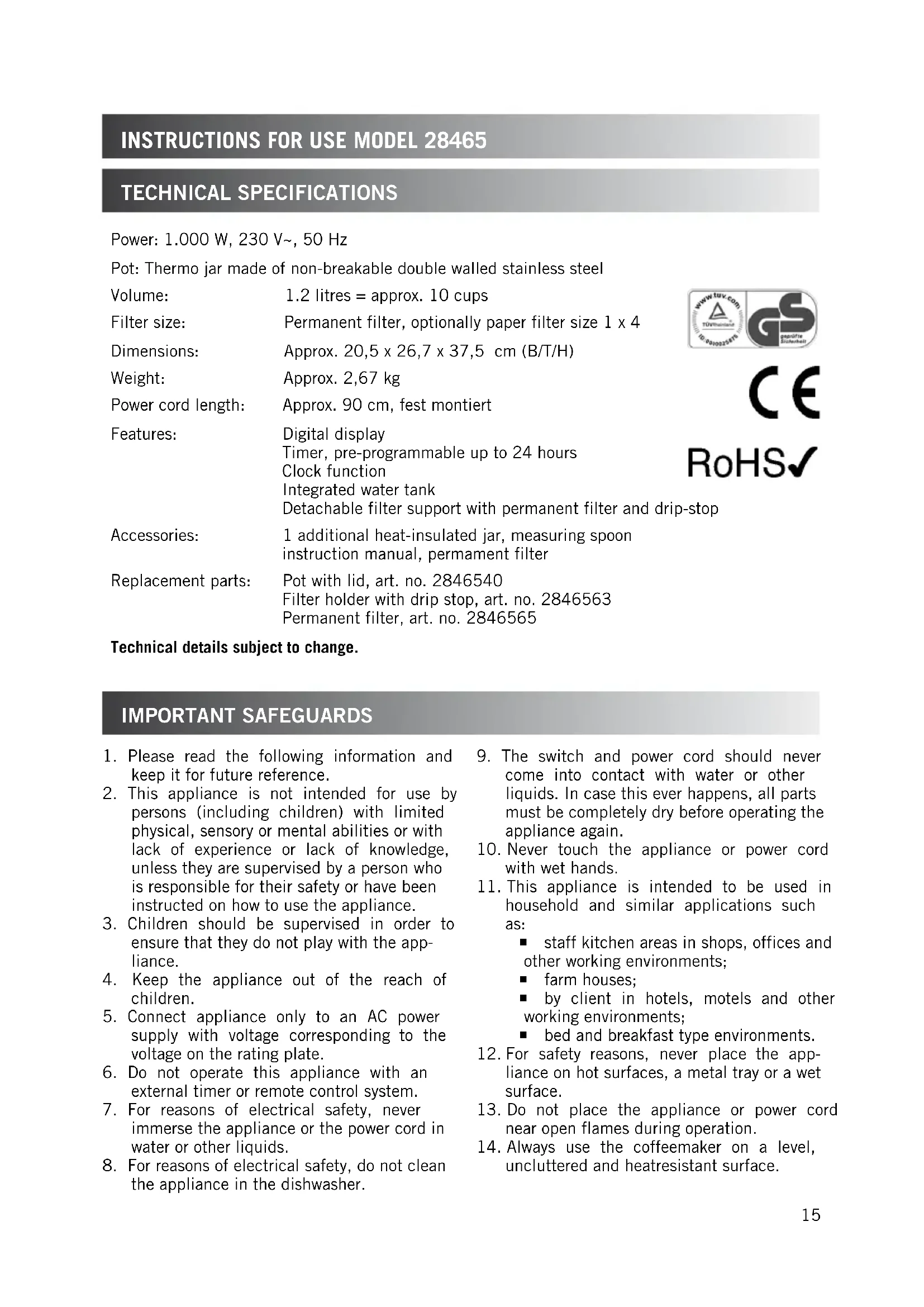 uncluttered and heatresistant surface. Power: 1.000 W, 230 V~, 50 Hz Pot: Thermo jar made of non-breakable double walled stainless steel Volume: 1.2 litres = approx. 10 cups Filter size: Permanent filter, optionally paper filter size 1 x 4 Dimensions: Approx. 20,5 x 26,7 x 37,5 cm (B/T/H) Weight: Approx. 2,67 kg Power cord length: Approx. 90 cm, fest montiert Features: Digital display Timer, pre-programmable up to 24 hours Clock function Integrated water tank Detachable filter support with permanent filter and drip-stop Accessories: 1 additional heat-insulated jar, measuring spoon instruction manual, permament filter Replacement parts: Pot with lid, art. no. 2846540 Filter holder with drip stop, art. no. 2846563 Permanent filter, art. no. 2846565 Technical details subject to change.16 tips for perfect coffee enjoyment