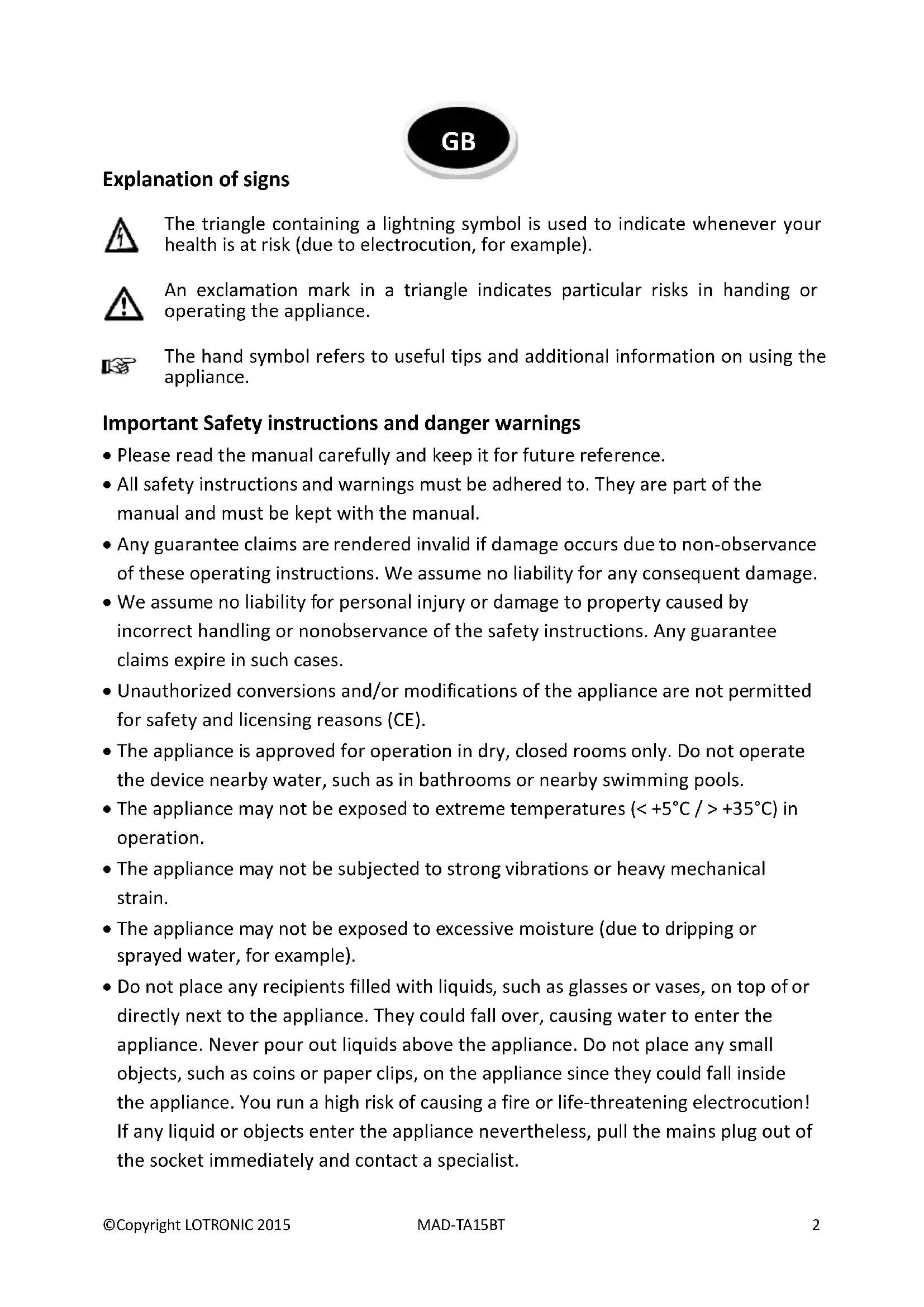 - Do not place any recipients filled with liquids, such as glasses or vases, on top of or directly next to the appliance. They could fall over, causing water to enter the appliance. Never pour out liquids above the appliance. Do not place any small objects, such as coins or paper clips, on the appliance since they could fall inside the appliance. You run a high risk of causing a fire or life-threatening electrocution! If any liquid or objects enter the appliance nevertheless, pull the mains plug out of the socket immediately and contact a specialist. GB©Copyright LOTRONIC 2015 MAD-TA15BT 3