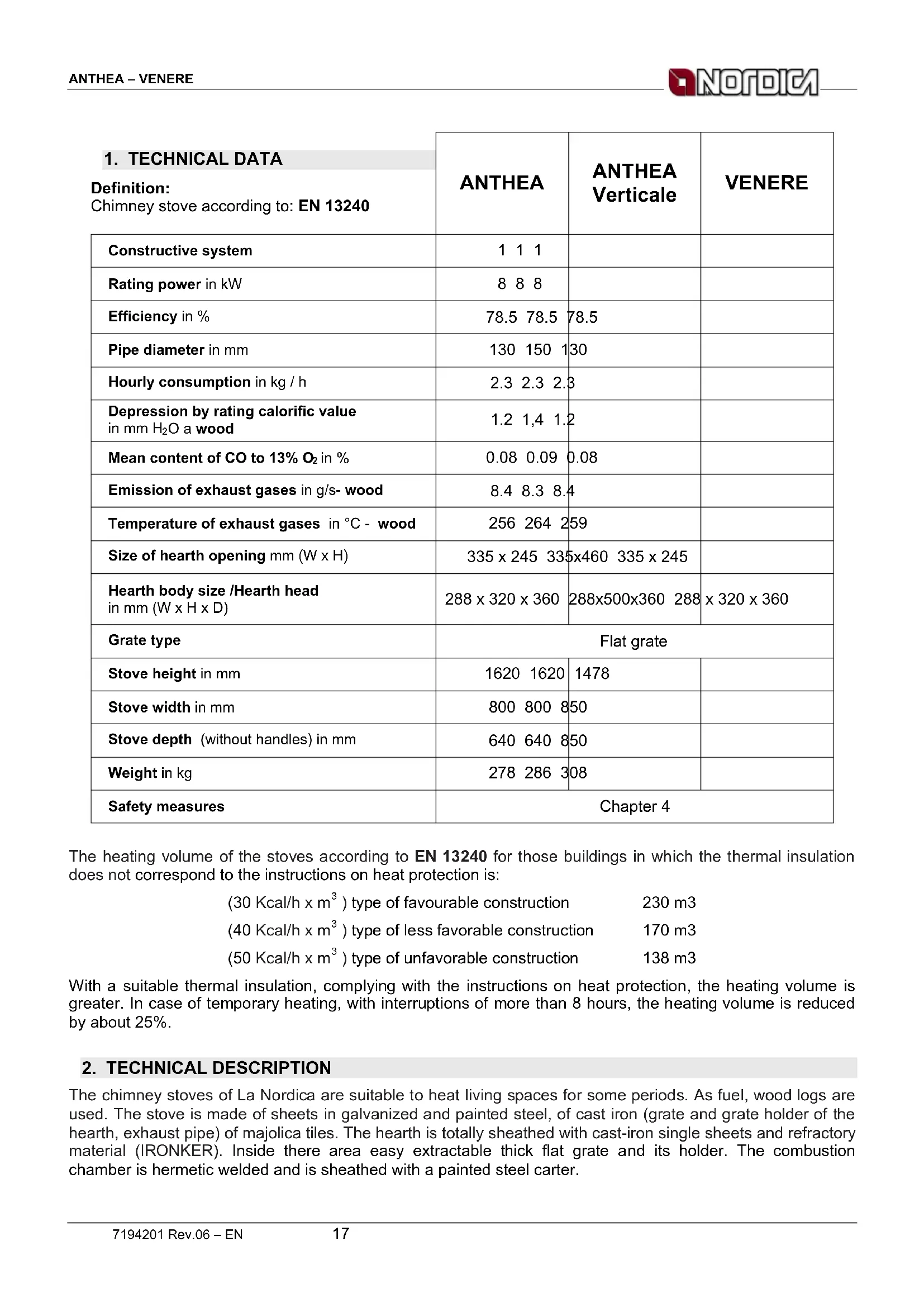| 1. TECHNICAL DATA Definition: Chimney stove according to: EN 13240 | ANTHEA | ANTHEA Verticale | VENERE |