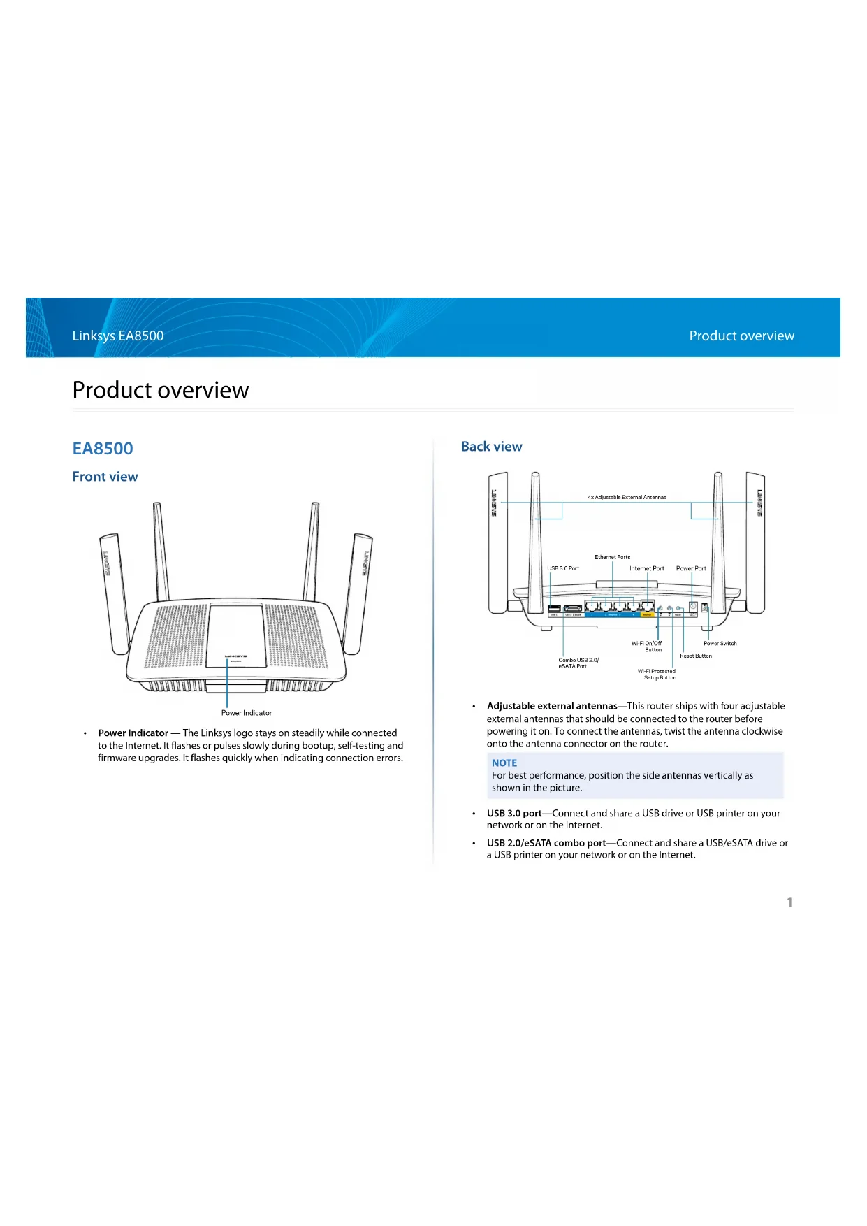 - Power switch—Press | (on) to power on the router.3 Linksys EA8500 Setting Up Your Router Where to find more help