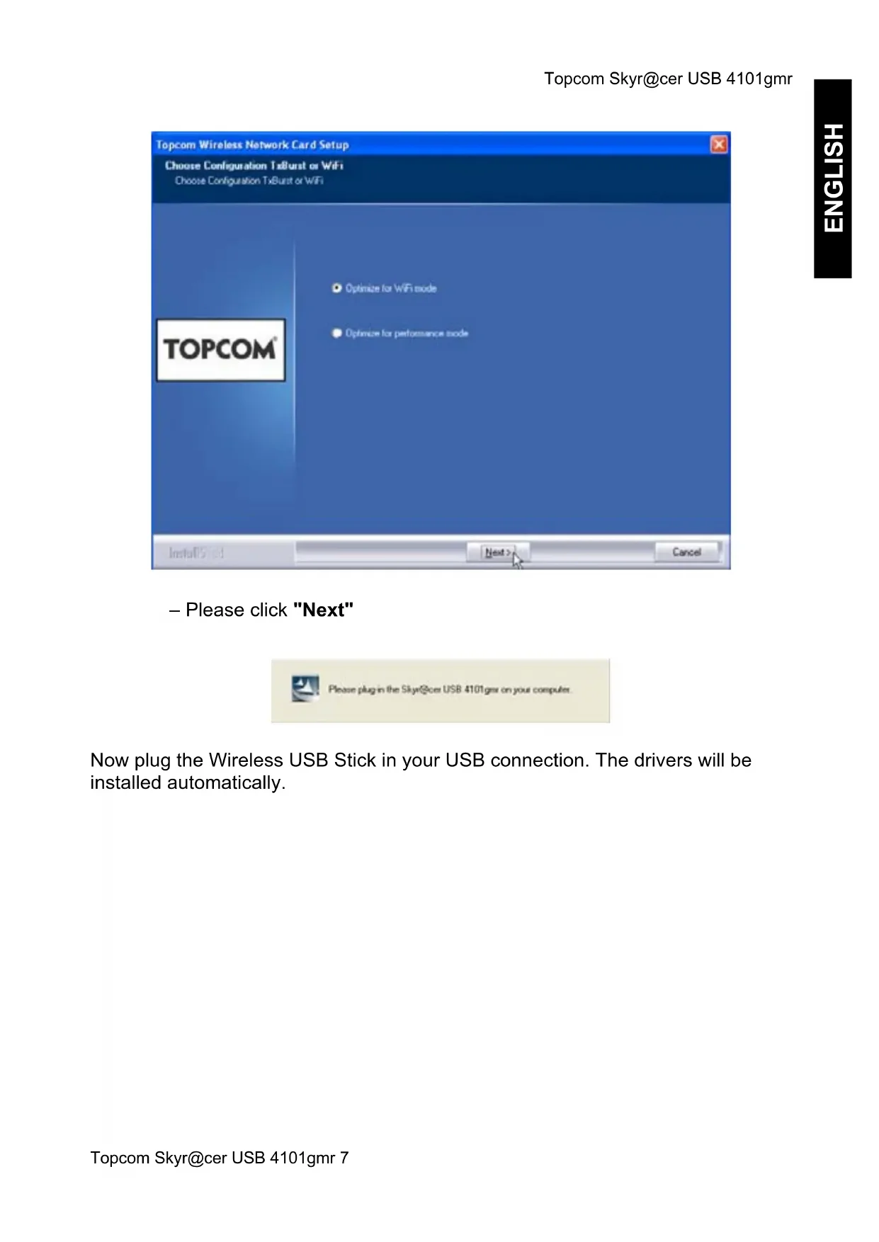 – Please click "Yes" to start the installation. – Please click "Next"Topcom Skyr@cer USB 4101gmr Topcom Skyr@cer USB 4101gmr 7 ENGLISH – Please click "Next" Now plug the Wireless USB Stick in your USB connection. The drivers will be installed automatically.Topcom Skyr@cer USB 4101gmr 8 Topcom Skyr@cer USB 4101gmr – Please click "Next" During the installation, next screen will appear: – Please click "Continue Anyway"Topcom Skyr@cer USB 4101gmr Topcom Skyr@cer USB 4101gmr 9 ENGLISH – Please click "Finish" – Please click "Finish" Once the installation is successful, the utility icon will show up in your Systray.Topcom Skyr@cer USB 4101gmr 10 Topcom Skyr@cer USB 4101gmr 3 Configuration Double-click the icon to open the utility. The "Site Survey" screen will appear. All available wireless networks are shown in the window. In the example above, the SSID is "Topcom" and WEP encryption is used. When you click "Connect", you can connect to the wireless network until the computer is switched off. If you click "Add to Profile", the settings for this Wireless Access Point (or Wireless Router) will be stored in the profile list. – Now select your Wireless Access Point and click "Add to Profile".Topcom Skyr@cer USB 4101gmr Topcom Skyr@cer USB 4101gmr 11 ENGLISH Next screen will appear: – Now enter a profile name : in example above "ROUTER" is created. – Click OK to confirm. Remark: If the Wireless Access Point has encryption settings, next screen will appear. In the example above, WEP encryption is used. – Click OKTopcom Skyr@cer USB 4101gmr 12 Topcom Skyr@cer USB 4101gmr Next screen will appear: – Enter the encryption key. Please make sure that exactly the same encryption type / key is entered as in your Wireless Access Point (or Wireless Router) – Click OK to confirm. Now the wireless profile is created.Topcom Skyr@cer USB 4101gmr Topcom Skyr@cer USB 4101gmr 13 ENGLISH – Now click "Activate" to activate the profile. The icon in front of the profile name and the icon in the systray indicate that the connection is successful. For more details, please read the full English user guide on the provided CD-rom.Topcom Skyr@cer USB 4101gmr 14 Topcom Skyr@cer USB 4101gmr 4Warranty