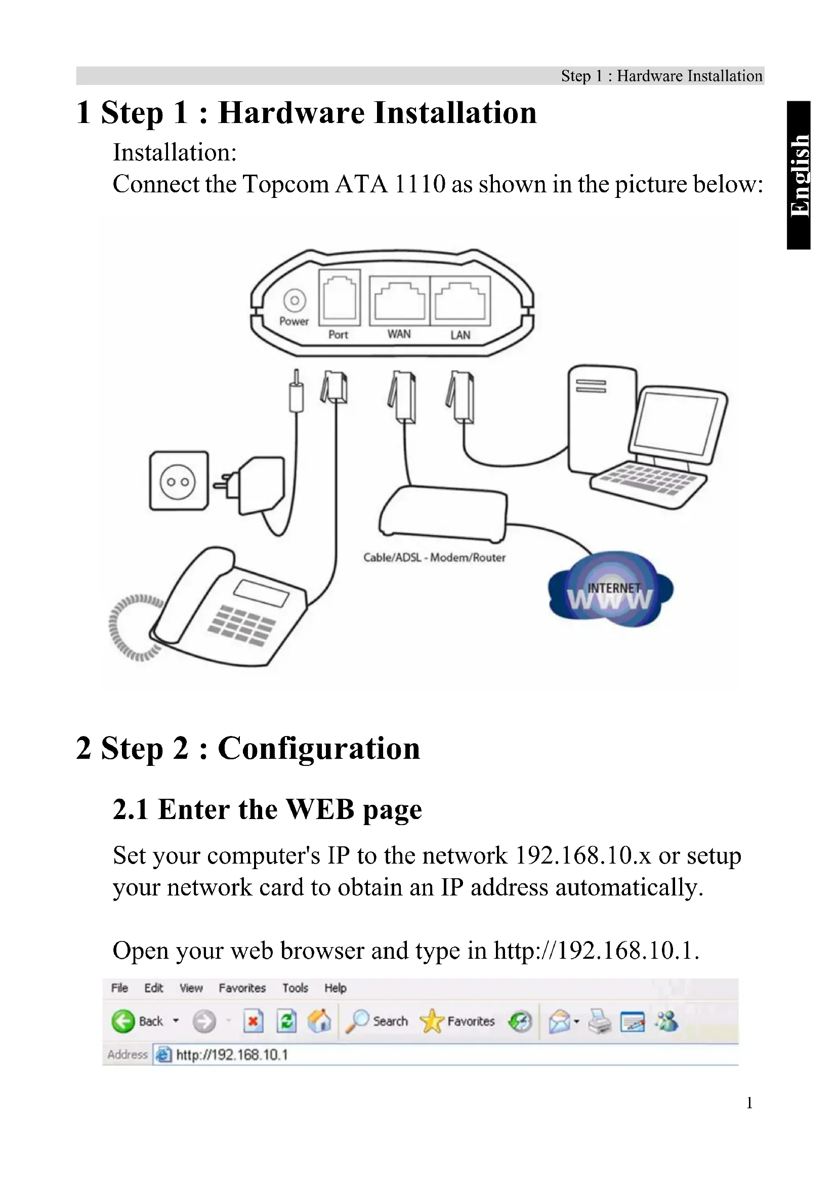 Set your computer's IP to the network 192.168.10.x or setup your network card to obtain an IP address automatically. Open your web browser and type in http://192.168.10.1.2 Step 2 : Configuration The logon page of ATA 1110 will appear: