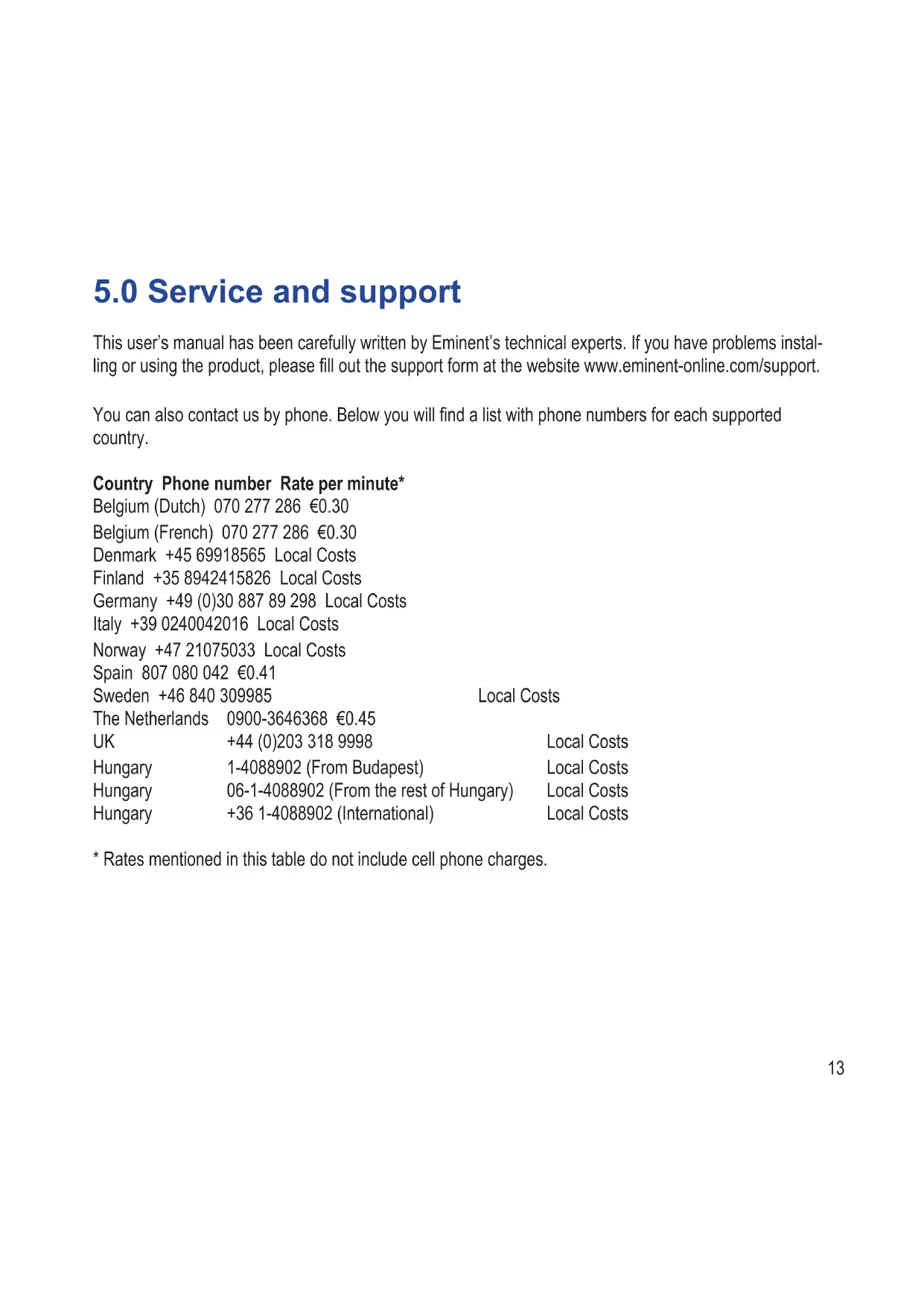 This user’s manual has been carefully written by Eminent’s technical experts. If you have problems instal- ling or using the product, please ll out the support form at the website www.eminent-online.com/support. You can also contact us by phone. Below you will nd a list with phone numbers for each supported country. Country Phone number Rate per minute* Belgium (Dutch) 070 277 286 €0.30 Belgium (French) 070 277 286 €0.30 Denmark +45 69918565 Local Costs Finland +35 8942415826 Local Costs Germany +49 (0)30 887 89 298 Local Costs Italy +39 0240042016 Local Costs Norway +47 21075033 Local Costs Spain 807 080 042 €0.41 Sweden +46 840 309985 Local Costs The Netherlands 0900-3646368 €0.45 UK +44 (0)203 318 9998 Local Costs Hungary 1-4088902 (From Budapest) Local Costs Hungary 06-1-4088902 (From the rest of Hungary) Local Costs Hungary +36 1-4088902 (International) Local Costs