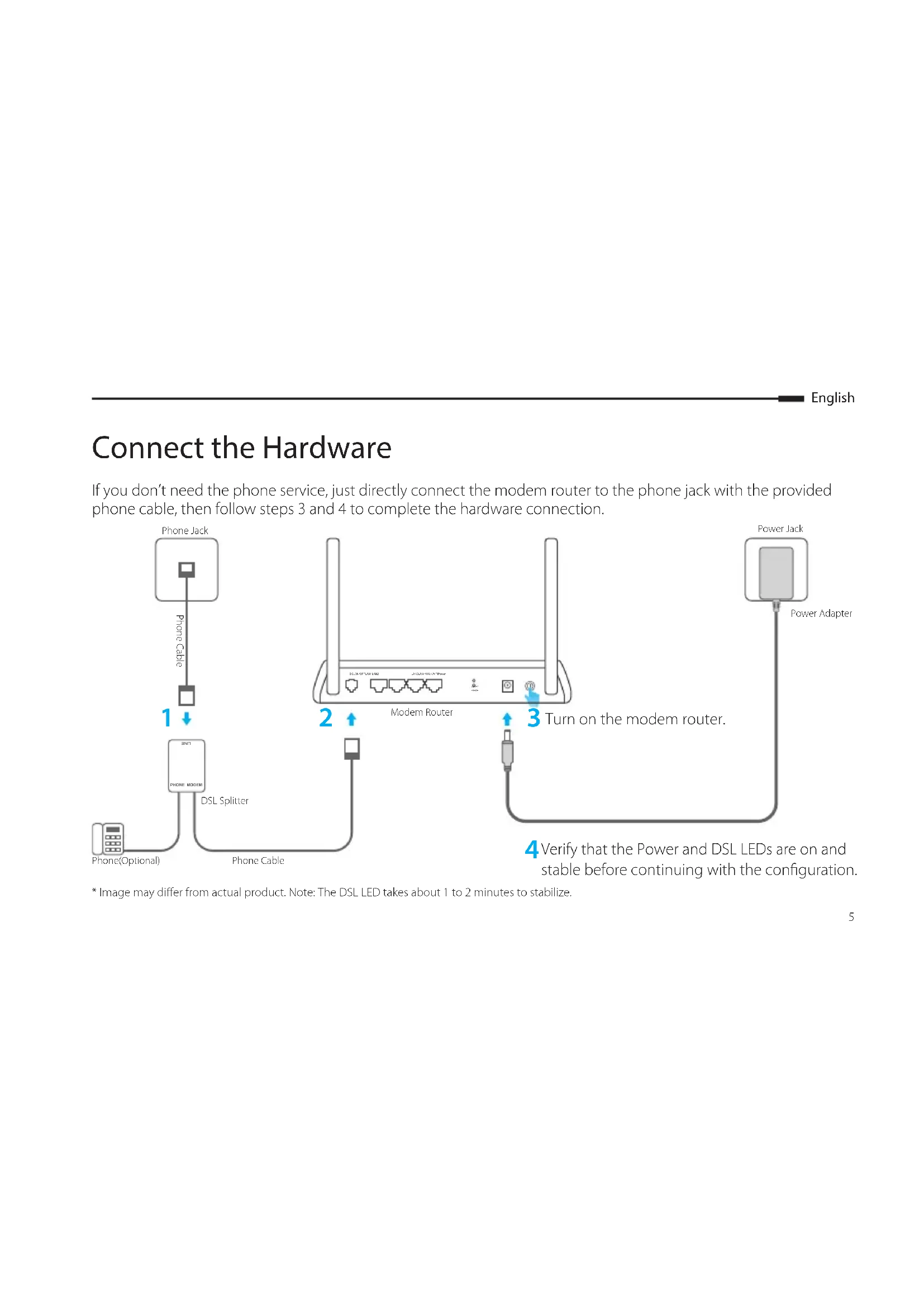 WPS/ RESETLAN3 LAN4/WAN WIFI Power* Image may dier from actual product. Note: The DSL LED takes about 1 to 2 minutes to stabilize. Verify that the Power and DSL LEDs are on and stable before continuing with the conguration. Phone JackPhone CablePhone CableModem Router Turn on the modem router. Power JackPower AdapterDSL Splitter Phone(Optional)English