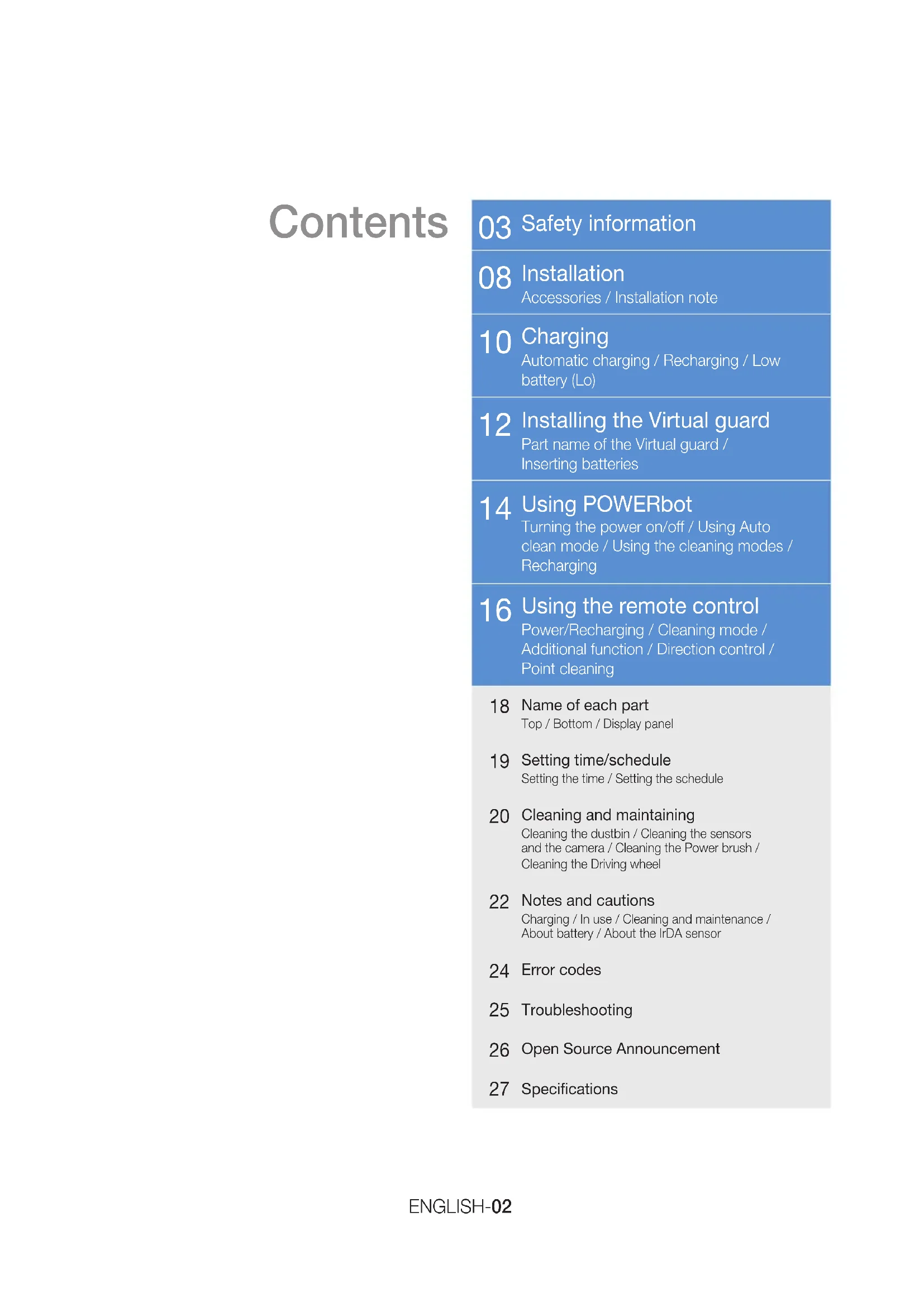 - Leaks from battery cells can occur under extreme usage or temperature conditions. If the liquid gets on skin, wash quickly with water. If the liquid gets into the eyes, flush them immediately with clean water for a minimum of 10 minutes. Seek medical attention. SR20H9050U#EN_EN_DJ68-00716E-00.indd 5 2014-08-11 오후 2:13:41ENGLISH-06 WARNING Power related ▶ Please prevent any risk of electric shock or fire. – Do not damage the power cord. – Do not pull the power cord too hard or touch the power plug with wet hands. – Do not use a power source other than 100- 240 V~ and also do not use a multi outlet to supply power to number of devices at the same time. (Do not leave the cord carelessly on the floor.) – Do not use a damaged power plug, power cord or loose power outlet. ▶ Clean dust or any foreign matters on the pin and contact part of the power plug. – There is a risk of electric shock or malfunction. WARNING Before use ▶ Do not use POWERbot near combustible materials. – Place near candle, desktop lamps, fireplace or near combustible materials such as gasoline, alcohol, thinners etc. ▶ The POWERbot is intended for household use therefore do not use it in an attic, basement, storage, industrial building, out of indoor space, places with moisture (such as bathroom, laundry), on the table or shelves. – The POWERbot can be damaged or malfunction. ▶ Install the Virtual guard in front of dangerous areas (such as stairs or railings) to prevent damaging the product or getting injured. – For your safety, always keep the cliff sensor clean. ▶ Be sure POWERbot does not pass through or touch any kind of liquids. – The POWERbot can be severely damaged and it may contaminate other areas if the wheels pass through liquid. ▶ Do not spill any liquids on the charger. – There is a risk of fire or electric shock. ▶ Do not use the charger for anything other than its intended purpose. – There is a risk of fire or severe damage to the charger. ▶ Always keep the cliff sensor clean for your safety. WARNING In use ▶ If any abnormal sounds, smells or smoke come from POWERbot, immediately shut off the emergency switch at the bottom of POWERbot and contact a service center. WARNING Cleaning and maintenance ▶ When power cord is damaged, contact a service center to get it replaced by certified repairman. – There is a risk of fire or electric shock. ▶ Please check with a Samsung Electronics service center when exchanging batteries. – Using batteries from other products can cause malfunction. Safety information SR20H9050U#EN_EN_DJ68-00716E-00.indd 6 2014-08-11 오후 2:13:41ENGLISH-07 CAUTION Before use ▶ Insert the dustbin before using POWERbot. ▶ Open room doors before cleaning in order to have all rooms cleaned and install a Virtual guard in front of entryway, balconies, bathrooms, or other areas where POWERbot may fall. ▶ Be careful with the followings for proper automatic recharging. – Always turn on the power of the charger. – Install the charger where POWERbot can easily find. – Do not leave any object in front of the charger. ▶ When installing the charger, do not leave the cord carelessly on the floor since POWERbot may get tangled by it. ▶ Do not use POWERbot on black colored floors. – The POWERbot may not be able to operate normally. ▶ Do not pick up POWERbot by the dustbin holder. ▶ Do not place any objects within 0.5 m to both sides and 1 m to the front of the charger. ▶ Make sure the charger's charging contact is not damaged or have any foreign matters on it. ▶ Do not install the charger in an area with a dark floor. – If the floor around the charger is dark, recharging is hindered. ▶ Move any obstacles that may disturb POWERbot's movement (such as children's indoor swing or slides) before cleaning. CAUTION In use ▶ Using POWERbot on thick carpet may damage both POWERbot and the carpet. – The POWERbot cannot pass over carpet that is thicker than 1 cm. ▶ Do not use POWERbot on tables or other high surfaces. – There is a risk of damage if it falls. ▶ The POWERbot may bump into chair, desk legs therefore move them away for faster and efficient cleaning. ▶ When POWERbot is operating, do not lift it up or carry it to another area. ▶ Do not hold by driving wheels of POWERbot when carrying it to another area. ▶ Do not put any objects on top of POWERbot since it may cause malfunction. ▶ Remove any large papers or plastic bags immediately when using POWERbot since they may block the intake. ▶ Do not aim the red pointer directly at people or animals. CAUTION Cleaning and maintenance ▶ Prevent any damage to POWERbot by complying the followings. – Do not clean POWERbot by spraying water directly onto it or use benzene, thinner, acetone or alcohol to clean it. ▶ Do not disassemble or repair POWERbot. This should only be done by a certified repairman. ▶ Always keep the obstacle sensor and cliff sensor clean. – If foreign matter accumulates, sensors may malfunction. SR20H9050U#EN_EN_DJ68-00716E-00.indd 7 2014-08-11 오후 2:13:41ENGLISH-08