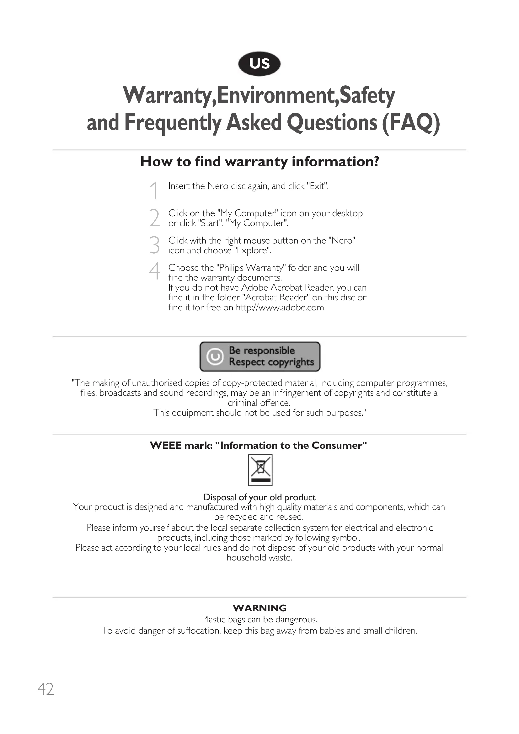 Choose the "Philips Warranty" folder and you will find the warranty documents. If you do not have Adobe Acrobat Reader, you can find it in the folder "Acrobat Reader" on this disc or find it for free on http://www.adobe.com "The making of unauthorised copies of copy-protected material, including computer programmes, files, broadcasts and sound recordings, may be an infringement of copyrights and constitute a criminal offence. This equipment should not be used for such purposes." WEEE mark: "Information to the Consumer" Disposal of your old product Your product is designed and manufactured with high quality materials and components, which can be recycled and reused. Please inform yourself about the local separate collection system for electrical and electronic products, including those marked by following symbol. Please act according to your local rules and do not dispose of your old products with your normal household waste. WARNING Plastic bags can be dangerous. To avoid danger of suffocation, keep this bag away from babies and small children. Warranty,Environment,Safety and Frequently Asked Questions (FAQ) US43 Frequently Asked Questions (FAQ) Question 1: I have a Windows 98 Second Edition PC and there is no CDROM device in the computer but I have another PC. How do I install the drivers?