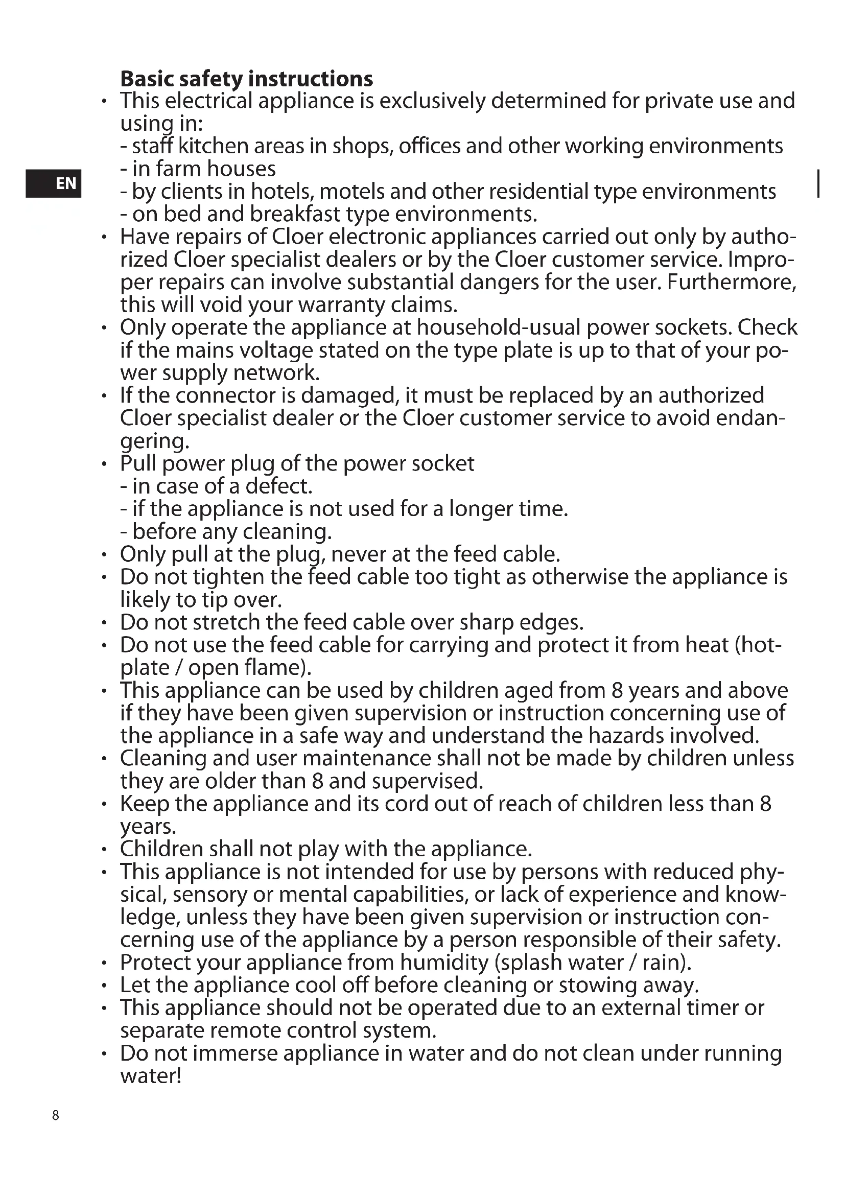 - Have repairs of Cloer electronic appliances carried out only by authorized Cloer specialist dealers or by the Cloer customer service. Improper repairs can involve substantial dangers for the user. Furthermore, this will void your warranty claims.