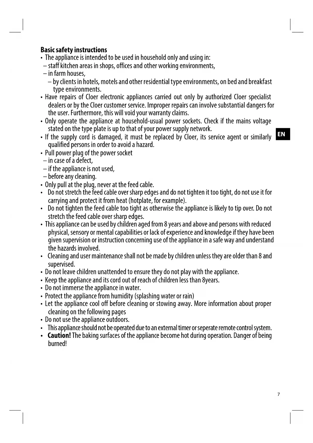 - Have repairs of Cloer electronic appliances carried out only by authorized Cloer specialist dealers or by the Cloer customer service. Improper repairs can involve substantial dangers for the user. Furthermore, this will void your warranty claims.