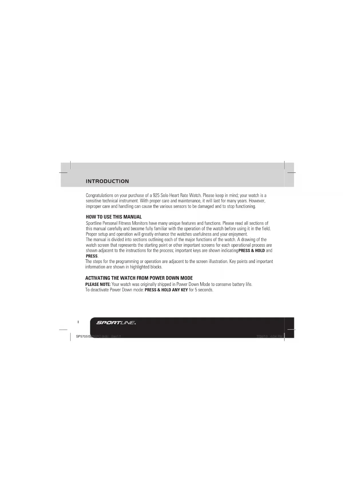 Sportline Personal Fitness Monitors have many unique features and functions. Please read all sections of this manual carefully and become fully familiar with the operation of the watch before using it in the field. Proper setup and operation will greatly enhance the watches usefulness and your enjoyment. The manual is divided into sections outlining each of the major functions of the watch. A drawing of the watch screen that represents the starting point or other important screens for each operational process are shown adjacent to the instructions for the process; important keys are shown indicating PRESS & HOLD and PRESS. The steps for the programming or operation are adjacent to the screen illustration. Key points and important information are shown in highlighted blocks. ACTIVATING THE WATCH FROM POWER DOWN MODE PLEASE NOTE: Your watch was originally shipped in Power Down Mode to conserve battery life. To deactivate Power Down mode: PRESS & HOLD ANY KEY for 5 seconds. SP5705IS03SPO.indd Sec1:1SP5705IS03SPO.indd Sec1:1 7/28/10 4:34 PM7/28/10 4:34 PM2 925 Solo WARNINGS & CAUTIONS