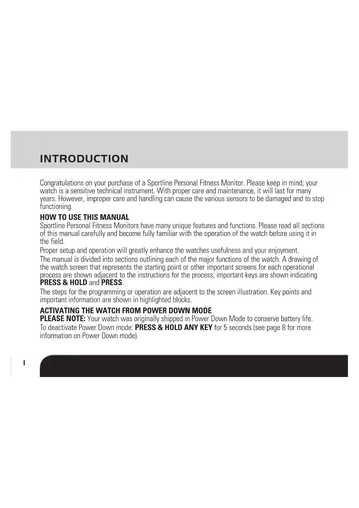 Sportline Personal Fitness Monitors have many unique features and functions. Please read all sections of this manual carefully and become fully familiar with the operation of the watch before using it in the field. Proper setup and operation will greatly enhance the watches usefulness and your enjoyment. The manual is divided into sections outlining each of the major functions of the watch. A drawing of the watch screen that represents the starting point or other important screens for each operational process are shown adjacent to the instructions for the process; important keys are shown indicating PRESS & HOLD and PRESS. The steps for the programming or operation are adjacent to the screen illustration. Key points and important information are shown in highlighted blocks. ACTIVATING THE WATCH FROM POWER DOWN MODE PLEASE NOTE: Your watch was originally shipped in Power Down Mode to conserve battery life. To deactivate Power Down mode: PRESS & HOLD ANY KEY for 5 seconds (see page 8 for more information on Power Down mode). INTRODUCTION SP4964IS03SPO.indd 1SP4964IS03SPO.indd 1 7/28/10 3:42 PM7/28/10 3:42 PM2 SOLO 915