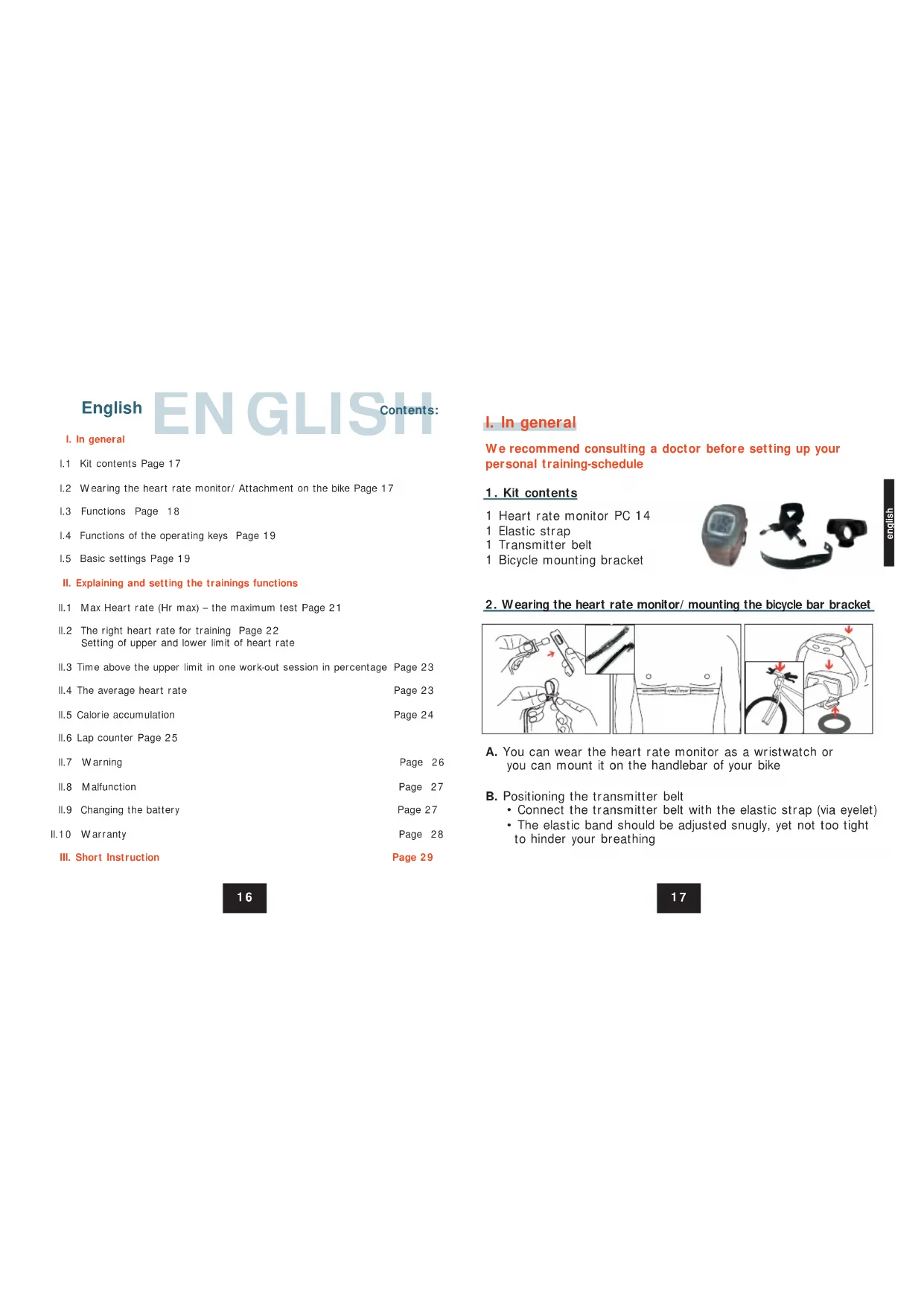 I.1 Kit contents Page 17 I.2 Wearing the heart rate monitor/Attachment on the bike Page 17 I.3 Functions Page 18 I.4 Functions of the operating keys Page 19 I.5 Basic settings Page 19