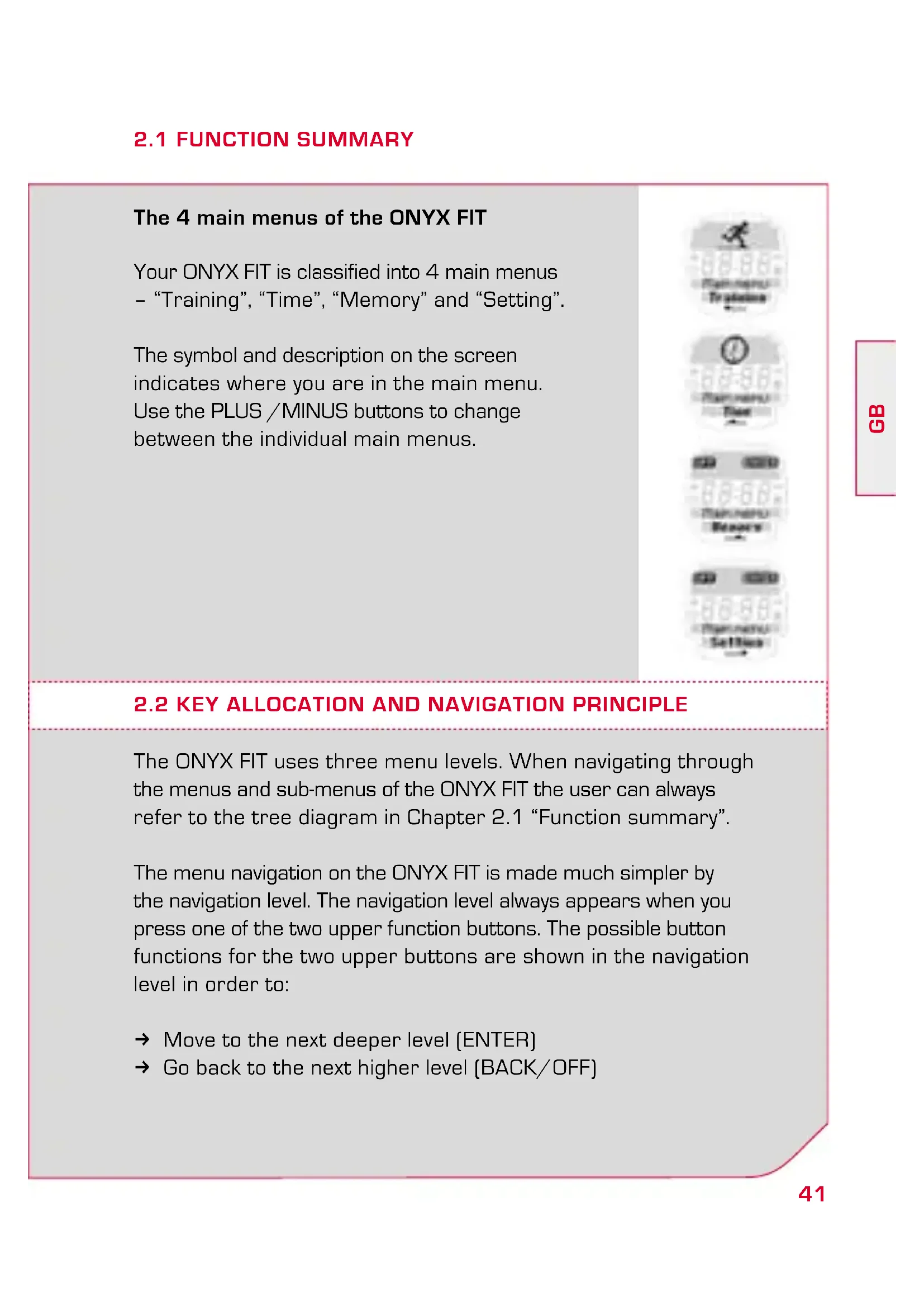 The 4 main menus of the ONYX FIT Your ONYX FIT is classified into 4 main menus – “Training”, “Time”, “Memory” and “Setting”. The symbol and description on the screen indicates where you are in the main menu. Use the PLUS /MINUS buttons to change between the individual main menus. The ONYX FIT uses three menu levels. When navigating through the menus and sub-menus of the ONYX FIT the user can always refer to the tree diagram in Chapter 2.1 “Function summary”. The menu navigation on the ONYX FIT is made much simpler by the navigation level. The navigation level always appears when you press one of the two upper function buttons. The possible button functions for the two upper buttons are shown in the navigation level in order to: k Move to the next deeper level (ENTER) k Go back to the next higher level (BACK/OFF)