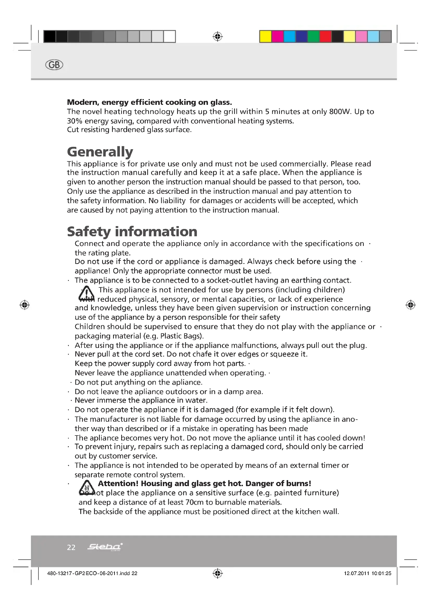Attention! Housing and glass get hot. Danger of burns! Do not place the appliance on a sensitive surface (e.g. painted furniture) and keep a distance of at least 70cm to burnable materials. The backside of the appliance must be positioned direct at the kitchen wall. 480-13217 - GP2 ECO - 06-2011.indd 22 12.07.2011 10:01:2523 Working place: Important: Never place this device on or next to hot surfaces (e.g. hot stoves). Only use it on a even, stable and a heat resisting surface. It is important that no inflamable items are near to the device. Handle the grill area with care. Do not use when any crack is visible. Safety requirements during usage: Only use the appliance at a safety plug socket. This should be connected to a earth ∙ leakage circuit breaker The appliance must be supplied through a residual current device(RCD) having a ∙ rated residual operating current not exceeding 30mA. Never immerse the appliance into water. ∙ Never leave the appliance outdoors after usage. ∙ Fat and other grill food can spatter and drop. Therefore do not place the appliance ∙ not directly on sensitive surfaces, e.g. Polished table tops, parquet or carpet. Be sure that the cable is placed that way that it cannot be pulled or touched during ∙ usage. Always unplug the appliance and cool it down before the device is carried away. ∙ Never carry it when it is hot. Unplug the appliance after each usage or before cleaning. ∙ Grill preparations: Oil the grill slightly before the usage. This makes it more easy to turn the food. Then heat up the device for ca 5 min; the thermostat on maximum level. The food should be not frozen during grilling. Please use the appliance only with the drip tray. Never cover the appliance with aluminium foil, because the heat cannot get away from the heating element. To avoid smoking and burning in of excessive fat or food residues, the grill plate should be wiped off repeatedly. As the grill plate can be very hot, use ca 3-4pcs of scrunched paper towels and wipe off the grill area with a grill tong. 480-13217 - GP2 ECO - 06-2011.indd 23 12.07.2011 10:01:2524 Power After the unit is plugged in and the switch at the side of the control unit is pressed. Press the button and in the display appears C0. Press another time the button and C5 will appear in the display, the appliance starts heating. To change the Power press first the Power button , in the display C5 is flashing. Now there is ca 5sec time to change the temperature or the display will return to C5. By pressing the / buttons the heating power can be changed. C5: 250°C Grilling on highest power C4: 210°C Grilling on middle power (e.g. fir tender meat) C3: 150°C Grilling on low power (e.g. fish or vegetable) C2: 120°C low temperature C1: 80°C keeping warm for dishes If there is not any pressing of the / buttons within 5 sec, then the power button must be pressed again to change it the power level. Timer Press the Timer button , in the display „00“ is flashing. Now there is ca 5sec time to change the Time or the display will return to the adjusted power level. By pressing the button the time can be changed. Button pressed only short time: 1 Minute steps Button pressed longer time: 10Minute steps Max adjustable time 99 minutes When the LED in the display is flashing, the timer is working. In the display you can see the Time and the adjusted Power changing. After the time run out the appliance will switch off and a beeping sound can be heard. Residual heat After a certain temperature is reached the residual heat light will be switched on. The residual heat light will flash after the unit is turned off until the plate cooled down. Notice: The appliance is equipped with a cooling fan. Never unplug the ap- pliance immediately after the unit is switched off. Please wait until the residual heat light turned off. With this damage of the electronic can be avoided. Cleaning and maintainance: The device should be cleaned after each use ∙ Unplug the device ∙ The device should cool down a little. It can be cleaned easier when it is not that ∙ hot. Never immerse the device in water! ∙ Use a humid cloth with a little bit of detergent to clean it. ∙ Burned in residues can be sprayed with an oven cleaner and should stay on the top ∙ for at least 1h. The solved residues can then be wiped away with a damp cloth. 480-13217 - GP2 ECO - 06-2011.indd 24 12.07.2011 10:01:2525 Disposal: Packaging disposal: Do not throw away the package materials. Please put it in the recycling bin. Gift box: Paper, should be put to the old paper collection point. Plastic packaging material and foils should be collected in the special collection containers. Correct Disposal of this product This marking indicates that this product should not be disposed with other household wastes throughout the EU. To prevent possible harm to the environment or human health from uncontrolled waste disposal, recycle it responsibly to promote the sustainable reuse of material resources. To return your used device, please use the return and collection systems or contact the retailer where the product was purchased. They can take this product for environmental safe recycling. Service and Repair: If the appliance must be repaired, plaese get in touch with your trader or with the manufacturer: STEBA Elektrogeräte GmbH & Co KG Pointstr. 2, 96129 Strullendorf / Germany Distribution-Tel.: 09543 / 449-17 / -18, Service-Tel.: 09543 / 449-44, Fax: 09543 / 449-19 e-Mail: elektro@steba.com Internet: http://www.steba.com 480-13217 - GP2 ECO - 06-2011.indd 25 12.07.2011 10:01:2626 Cuisson moderne économisant de l‘énergie sur le verre. Le système de chauffage d‘un genre nouveau chauffe en 5 minutes avec seulement 800 watts. Économie d’énergie par rapport aux systèmes de chauffage traditionnels jusqu’à 30 %. Surface en verre dur résistant à tout ce qui coupe. Généralement Cet appareil est conçu pour un usage privé et non commercial. Veuillez lire att