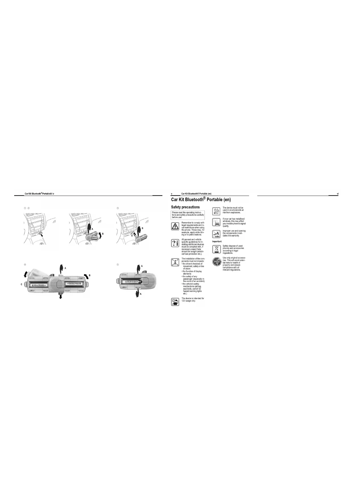 Portable (en) Safety precautions Please read the operating instruc- tions and safety precautions carefully before use! Remember to comply with legal requirements and lo- cal restrictions when using the phone. These may, for example, apply while driv- ing or in petrol stations. All general and vehicle specific guidelines for in- stalling additional devices must be complied with, if necessary expert help should be sought (electri- cal fuse protection etc.). The installation of the com- ponents must not impede: