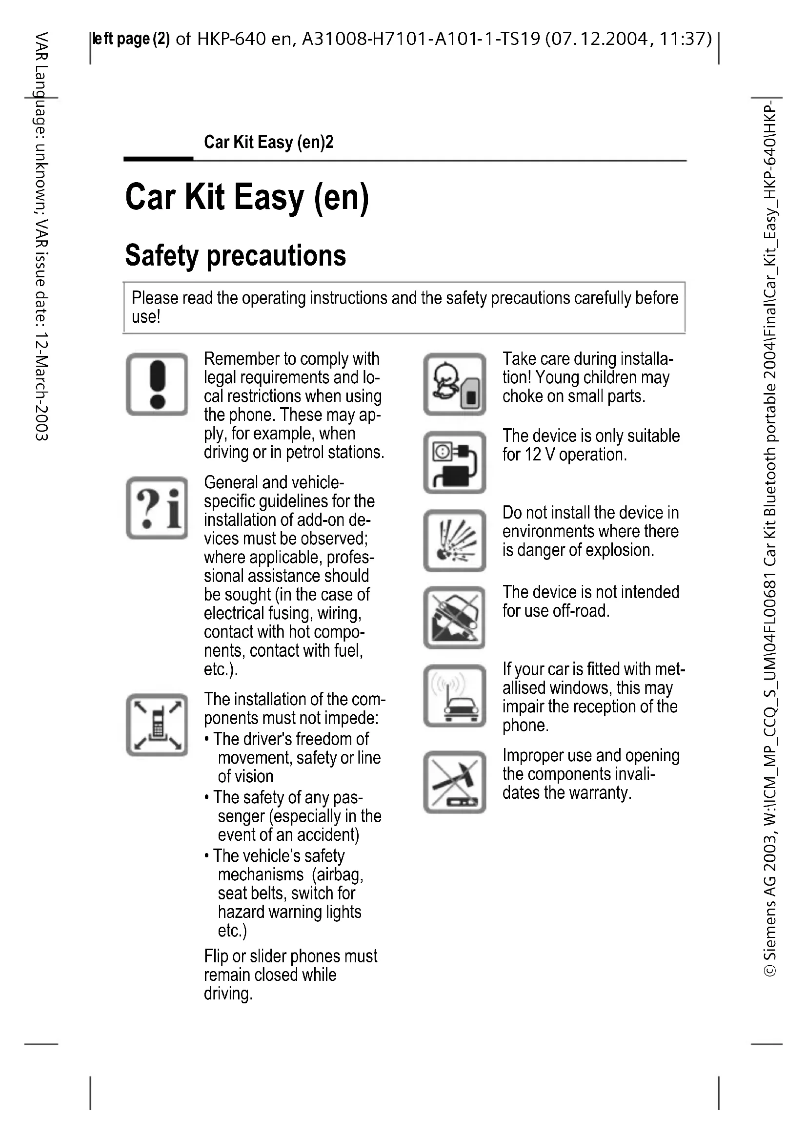 37) Car Kit Easy (en)2 VAR Language: unknown; VAR issue date: 12-March-2003 Car Kit Easy (en) Safety precautions Please read the operating instructions and the safety precautions carefully before use! Remember to comply with legal requirements and lo- cal restrictions when using the phone. These may ap- ply, for example, when driving or in petrol stations. General and vehicle- specific guidelines for the installation of add-on de- vices must be observed; where applicable, profes- sional assistance should be sought (in the case of electrical fusing, wiring, contact with hot compo- nents, contact with fuel, etc.). The installation of the com- ponents must not impede:
