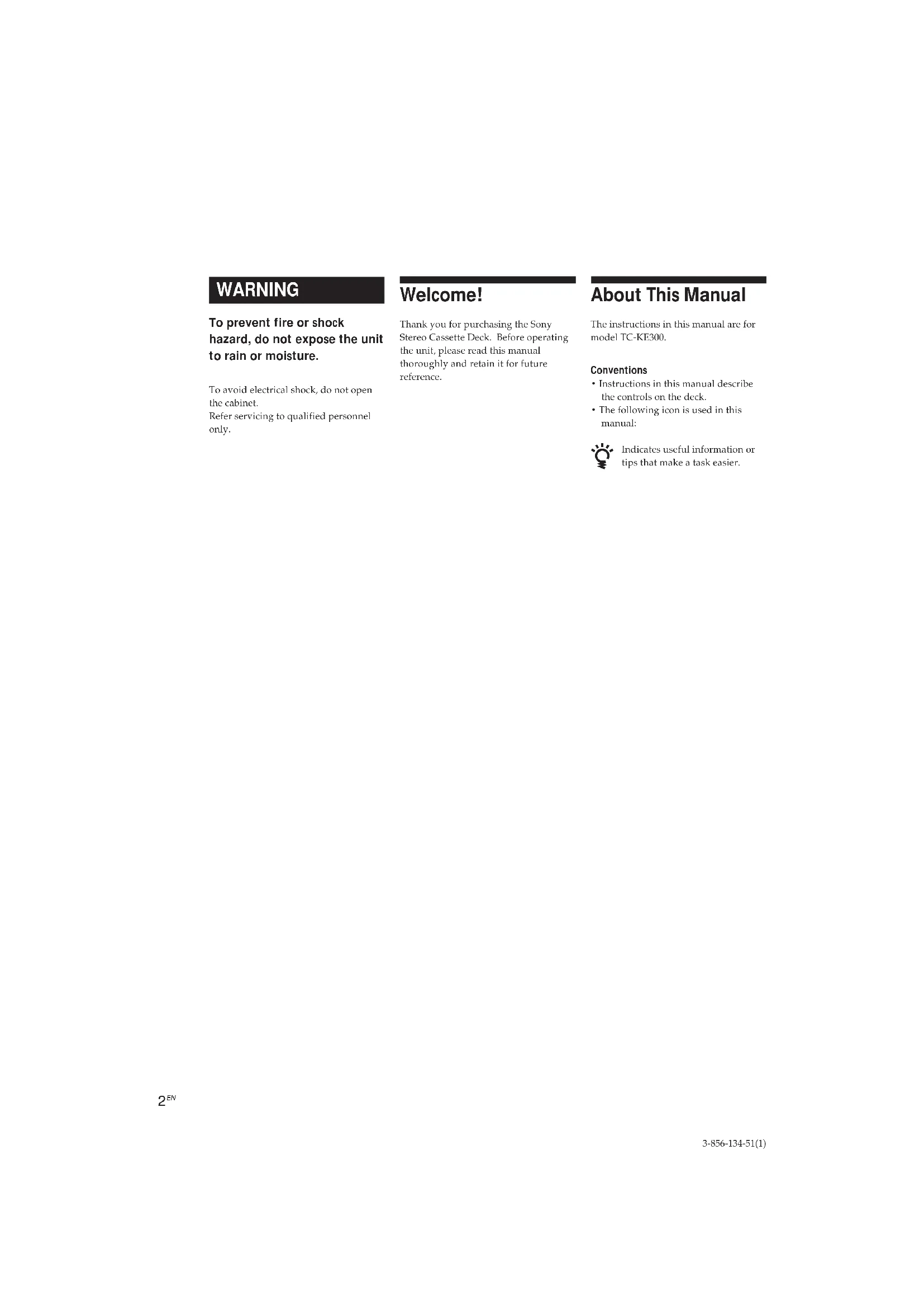 WARNING To prevent fire or shock hazard, do not expose the unit to rain or moisture. To avoid electrical shock, do not openthe cabinet.Refer servicing to qualified personnelonly. Welcome! Thank you for purchasing the SonyStereo Cassette Deck. Before operatingthe unit, please read this manualthoroughly and retain it for futurereference. About This Manual The instructions in this manual are formodel TC-KE300. Conventions