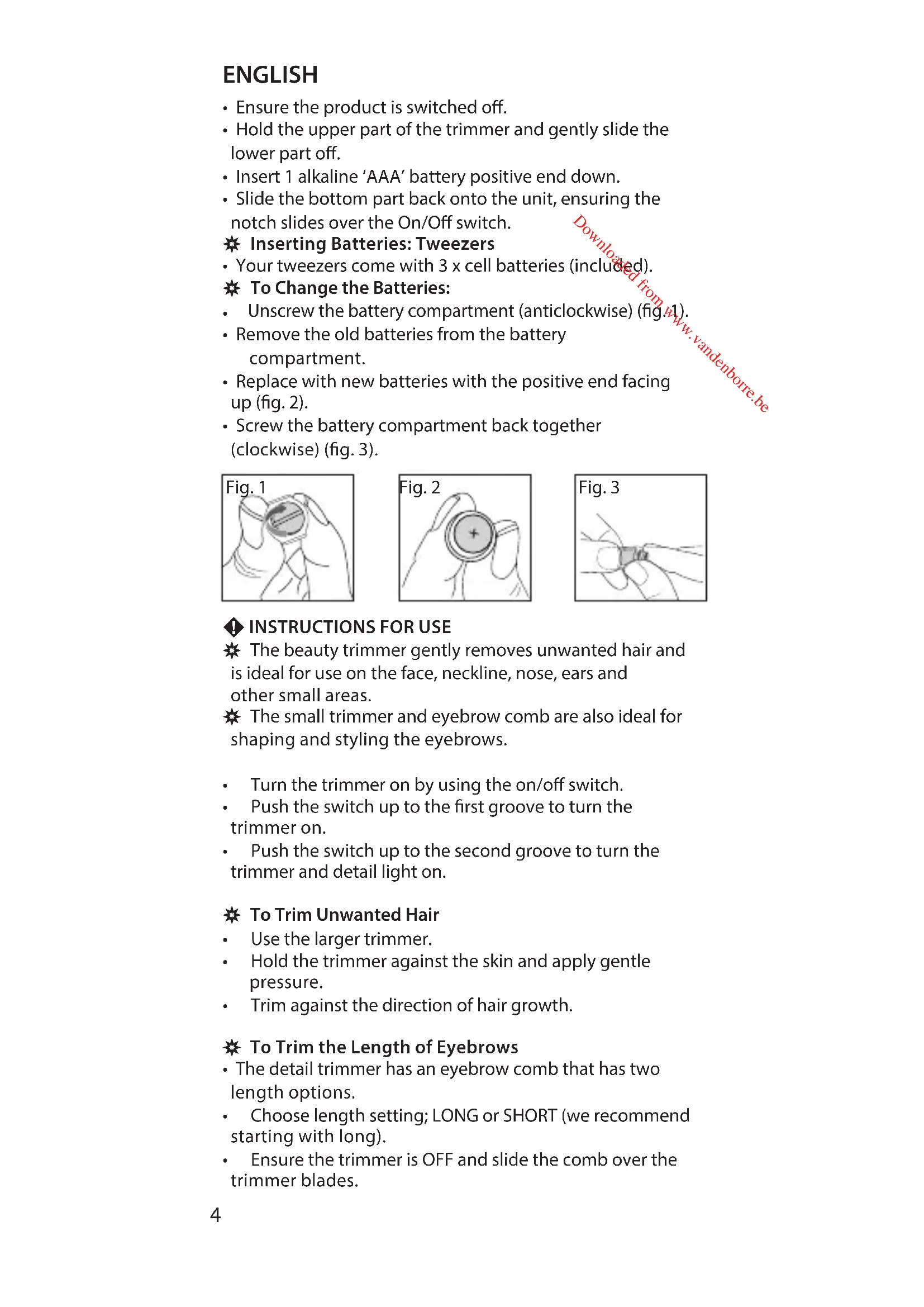 Downloaded from www.vandenborre.beC KEY FEATURES , Trimmer: 1 Dual Blade Trimmer 2 Flexing Head 3 Eyebrow Comb 4 Protective Cap 5 On/O Switch 6 Battery Compartment 7 Detail Light 8 Cleaning Brush (not shown) , Tweezers: 9 LED On/O Switch 10 Battery Compartment