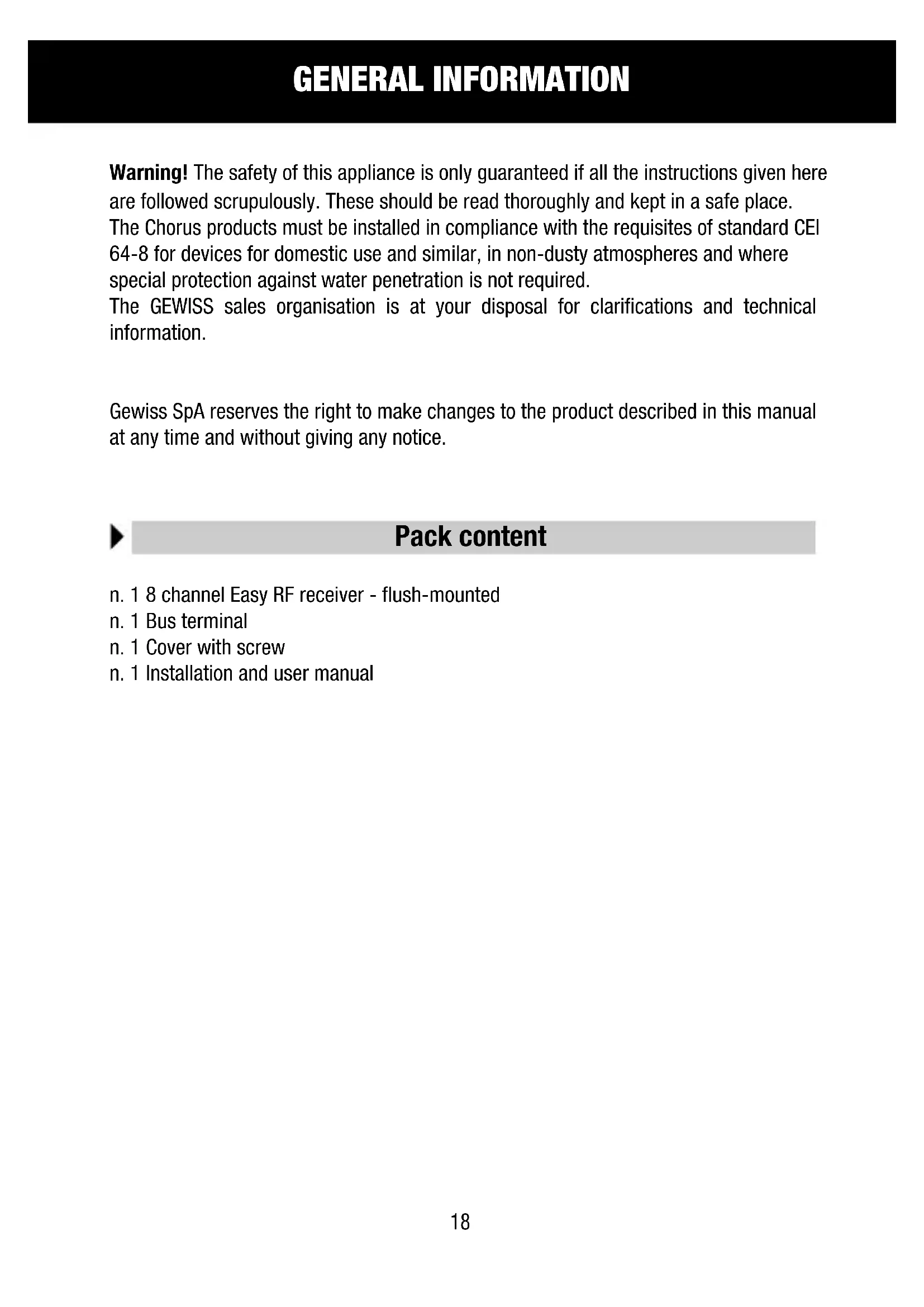Warning! The safety of this appliance is only guaranteed if all the instructions given here are followed scrupulously. These should be read thoroughly and kept in a safe place. The Chorus products must be installed in compliance with the requisites of standard CEI 64-8 for devices for domestic use and similar, in non-dusty atmospheres and where special protection against water penetration is not required.