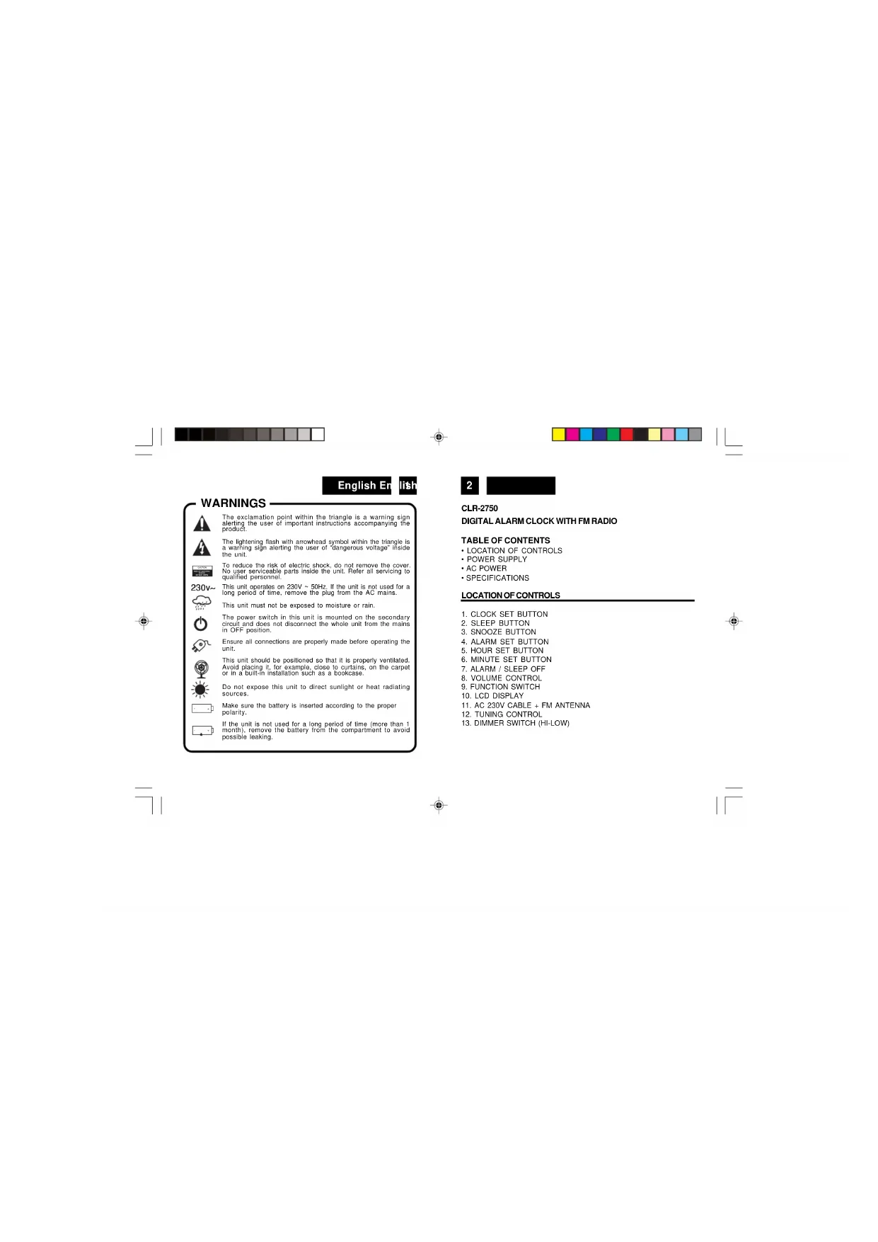 Correct Disposal of This Product (Waste Electrical & Electronic Equipment) This marking shown on the product or its literature, indicates that it should not be disposed with other household wastes at the end of its working life. To prevent possible harm to the environment or human health from uncontrolled waste disposal, please separate this from other types of wastes and recycle it responsibly to promote the sustainable reuse of material resources. Household users should contact either the retailer where they purchased this product, or their local government office, for details of where and how they can take this item for environmentally safe recycling. Business users should contact their supplier and check the terms and conditions of the purchase contract. This product should not be mixed with other commercial wastes for disposal. SPECIFICATIONS FM Band: 87.5 to 108 MHz Power Supply: 230VAC, 50 Hz Back-up Battery : 9V DC 006P (not included) Design and specifications are subject to change without notice.Deutsch Deutsch CLR-2750