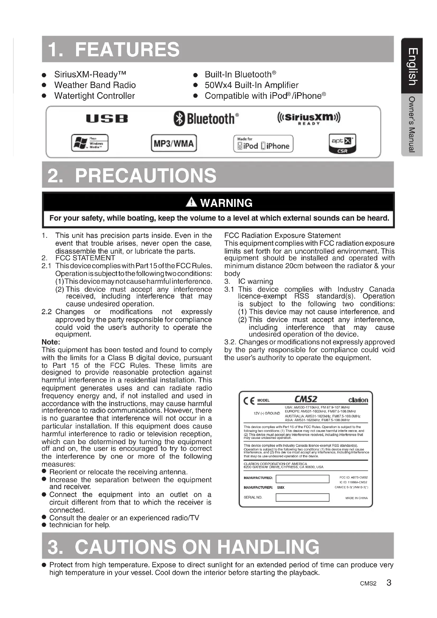 Protect from high temperature. Expose to direct sunlight for an extended period of time can produce very high temperature in your vessel. Cool down the interior before starting the playback. USA: AM530-1710kHz, FM 87.9-107.9MHz EUROPE: AM531-1602kHz, FM87.5-108.0MHz AUSTRALIA: AM531-1620kHz, FM87.5-108.0MHz ASIA: AM531-1620kHz, FM87.5-108.0MHz This device complies with Part 15 of the FCC Rules. Operation is subject to the following two conditions: (1) This device may not cause harmful interfe rence, and (2) This device must accept any interference received, including interference that may cause undesired operation. This device complies with Industry Canada licence-exempt RSS standard(s). Operation is subject to the following two conditions: (1) this device may not cause interference, and (2) this dev ice must accept any interference, including interference that may ca use undesired operation of the device.
