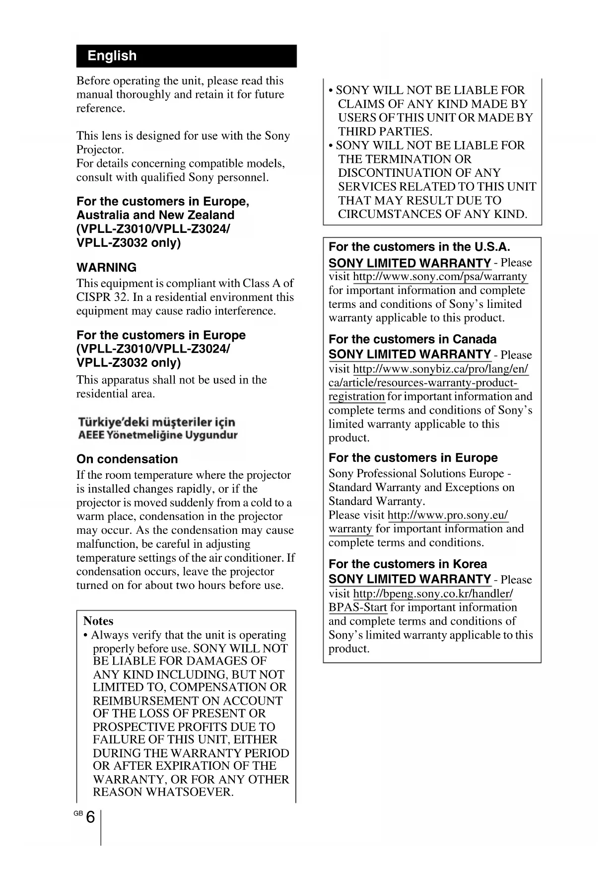 Before operating the unit, please read this manual thoroughly and retain it for future reference. This lens is designed for use with the Sony Projector. For details concerning compatible models, consult with qualified Sony personnel. For the customers in Europe, Australia and New Zealand (VPLL-Z3010/VPLL-Z3024/ VPLL-Z3032 only) WARNING This equipment is compliant with Class A of CISPR 32. In a residential environment this equipment may cause radio interference. For the customers in Europe (VPLL-Z3010/VPLL-Z3024/ VPLL-Z3032 only) This apparatus shall not be used in the residential area. On condensation If the room temperature where the projector is installed changes rapidly, or if the projector is moved suddenly from a cold to a warm place, condensation in the projector may occur. As the condensation may cause malfunction, be careful in adjusting temperature settings of the air conditioner. If condensation occurs, leave the projector turned on for about two hours before use. Notes