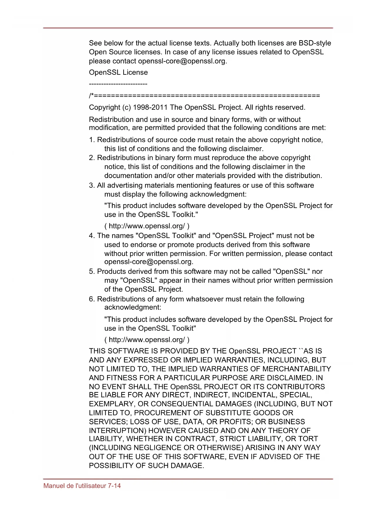 acknowledgment: "This product includes software developed by the OpenSSL Project for use in the OpenSSL Toolkit" ( http://www.openssl.org/ ) THIS SOFTWARE IS PROVIDED BY THE OpenSSL PROJECT ``AS IS AND ANY EXPRESSED OR IMPLIED WARRANTIES, INCLUDING, BUT NOT LIMITED TO, THE IMPLIED WARRANTIES OF MERCHANTABILITY AND FITNESS FOR A PARTICULAR PURPOSE ARE DISCLAIMED. IN NO EVENT SHALL THE OpenSSL PROJECT OR ITS CONTRIBUTORS BE LIABLE FOR ANY DIRECT, INDIRECT, INCIDENTAL, SPECIAL, EXEMPLARY, OR CONSEQUENTIAL DAMAGES (INCLUDING, BUT NOT LIMITED TO, PROCUREMENT OF SUBSTITUTE GOODS OR SERVICES; LOSS OF USE, DATA, OR PROFITS; OR BUSINESS INTERRUPTION) HOWEVER CAUSED AND ON ANY THEORY OF LIABILITY, WHETHER IN CONTRACT, STRICT LIABILITY, OR TORT (INCLUDING NEGLIGENCE OR OTHERWISE) ARISING IN ANY WAY OUT OF THE USE OF THIS SOFTWARE, EVEN IF ADVISED OF THE POSSIBILITY OF SUCH DAMAGE. Manuel de l'utilisateur 7-14===================================================== This product includes cryptographic software written by Eric Young (eay@cryptsoft.com). This product includes software written by Tim Hudson (tjh@cryptsoft.com).