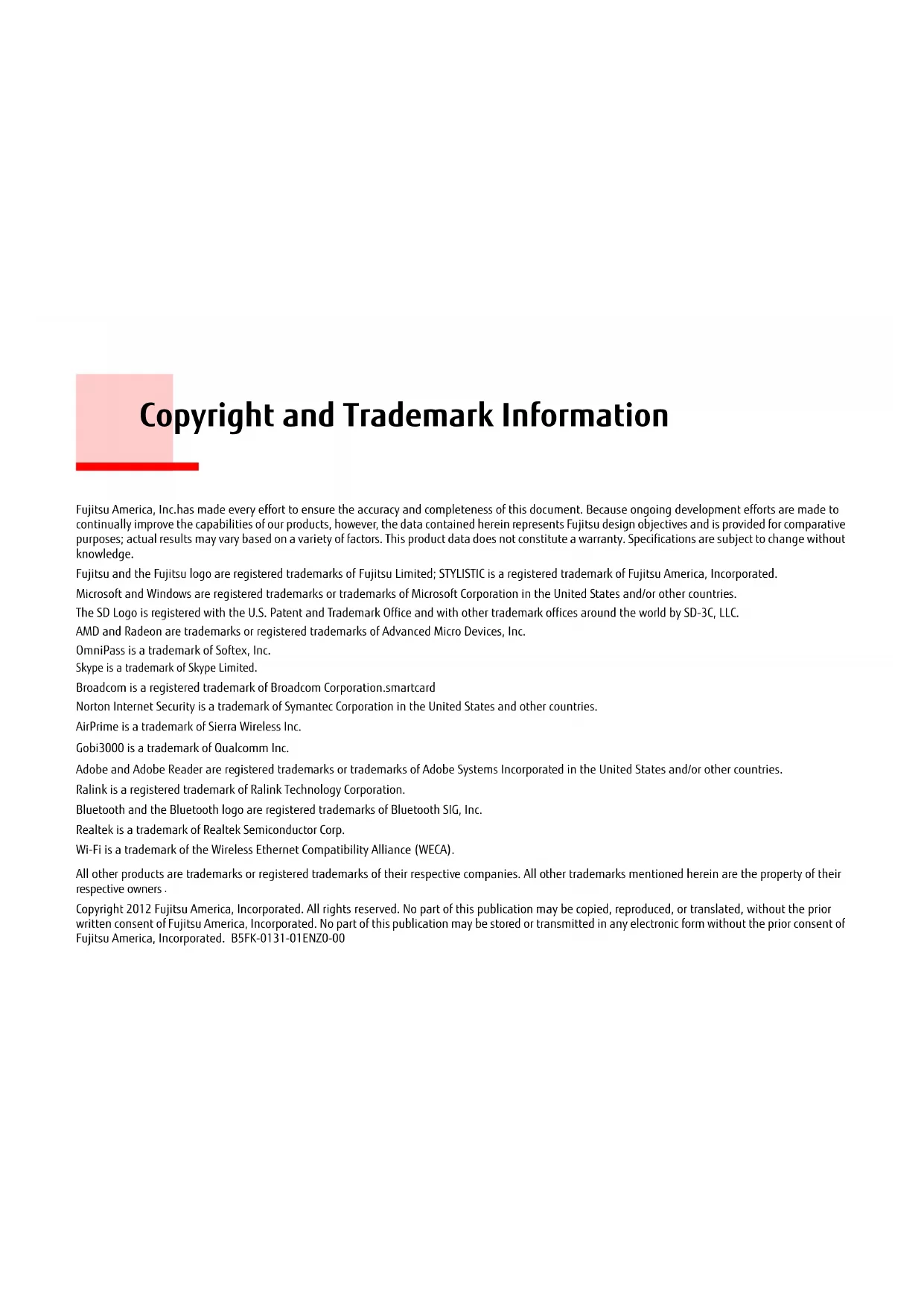 Q572 Tablet PCCopyright and Trademark Information Fujitsu America, Inc.has made every effort to ensure the accuracy and completeness of this document. Because ongoing development efforts are made to continually improve the capabilities of our products, however, the data contained herein represents Fujitsu design objectives and is provided for comparative purposes; actual results may vary based on a variety of factors. This product data does not constitute a warranty. Specifications are subject to change without knowledge. Fujitsu and the Fujitsu logo are registered trademarks of Fujitsu Limited; STYLISTIC is a registered trademark of Fujitsu America, Incorporated. Microsoft and Windows are registered trademarks or trademarks of Microsoft Corporation in the United States and/or other countries. The SD Logo is registered with the U.S. Patent and Trademark Office and with other trademark offices around the world by SD-3C, LLC. AMD and Radeon are trademarks or registered trademarks of Advanced Micro Devices, Inc. OmniPass is a trademark of Softex, Inc. Skype is a trademark of Skype Limited. Broadcom is a registered trademark of Broadcom Corporation.smartcard Norton Internet Security is a trademark of Symantec Corporation in the United States and other countries. AirPrime is a trademark of Sierra Wireless Inc. Gobi3000 is a trademark of Qualcomm Inc. Adobe and Adobe Reader are registered trademarks or trademarks of Adobe Systems Incorporated in the United States and/or other countries. Ralink is a registered trademark of Ralink Technology Corporation. Bluetooth and the Bluetooth logo are registered trademarks of Bluetooth SIG, Inc. Realtek is a trademark of Realtek Semiconductor Corp. Wi-Fi is a trademark of the Wireless Ethernet Compatibility Alliance (WECA). All other products are trademarks or registered trademarks of their respective companies. All other trademarks mentioned herein are the property of their respective owners