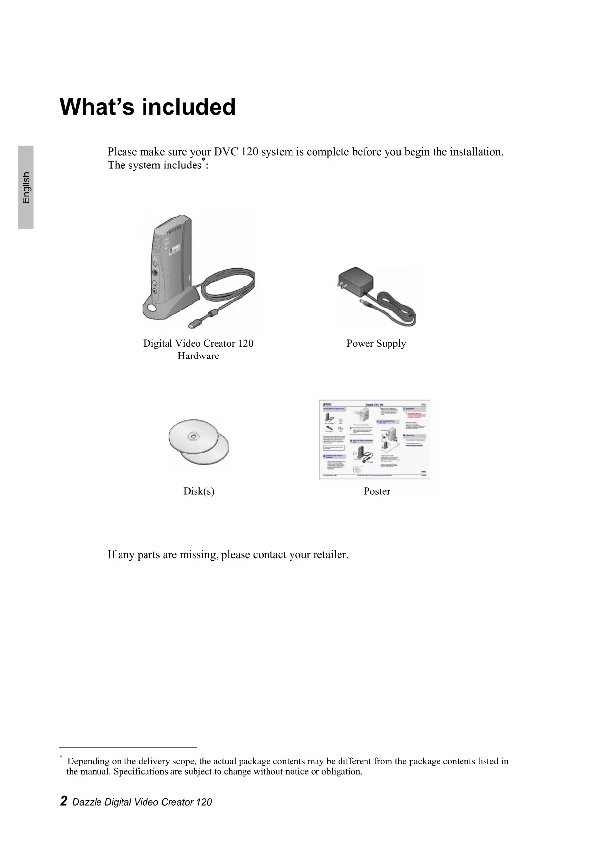 GUIA DE INÍCIO RÁPIDODazzle Digital Video Creator 120 QUICKSTART GUIDE2 Dazzle Digital Video Creator 120 English What’s included Please make sure your DVC 120 system is complete before you begin the installation. The system includes
